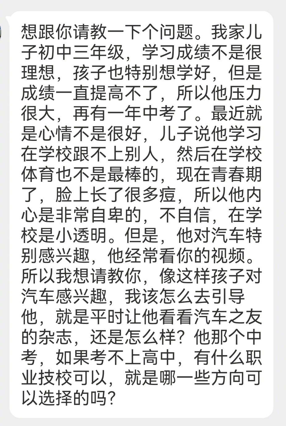 给家里孩子看:每个人能力有差异,擅长的事不同,但上进心这个很宝贵,这是可遇不可求的。喜欢汽车就很好啊,起码有个自己明确爱好,并且汽车也是未来很多年主流行业,很不错的兴趣爱好。我建议,如果学习困难,那就省一些精力,把工作后用得到的:地理、化学、物理多钻透。你就说服自己一点:你喜欢的汽车,跟这些有强关系,不会哪行?其他学科大差不差,弄个普通大学上就行,这样孩子没那么累。上大学期间多研究自己爱好,看看基于自己兴趣能钻多深,为以后工作做准备。脸上痘痘也是自卑重要原因,认真去三甲医院皮肤科看看,能很大程度好转,这个事不能忽视,很重要!另外,强烈建议:多研究AI相关,复杂可能不会,但继续AI内容生产的AI剧本师、AI编导、AI故事宇宙构建师、AI脚本描绘师等,未来15年会非常吃香及抢手,也可以和汽车有关。总之,有追求有兴趣点,就超越90%同龄人了,加油!大3可实习时候,再私信我,我司给实习机会,把握住。