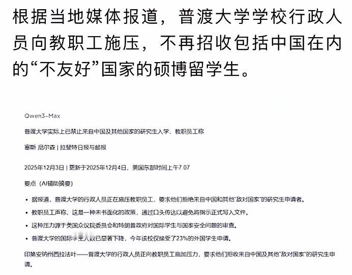 普渡大学这操作真让人无语!华裔校长蒋濛竟以中国是“敌对国家”为由,拒收中国硕博留学生,还玩“口头传达”避免留书面证据,妥妥暗箱操作。 美国这么做,本质是怕中国发展,想用打压留学生来维护霸权。但这有用吗?中国在各方面都勇往直前,超越美国只是时间问题。 普渡大学以前可是中国留学生扎堆的地方,之前一年录中国本科超八百人,现在呢,录取率低到离谱。而且只针对研究生,因为怕技术泄漏。可美国高端科技行业华人从业者占半壁江山,断了中国生源,这不是自断臂膀吗?这行径比汉奸还恶劣,真荒唐!