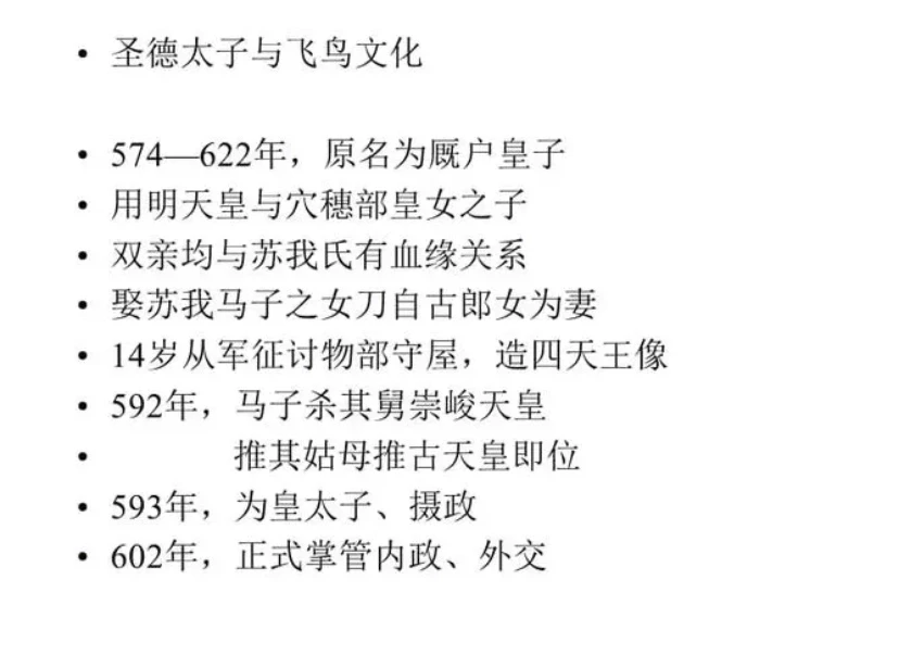 6世纪中叶,中央贵族围绕是否接受佛教展开了革新派和保守派的斗争。以苏我氏为首的部分贵族是革新派。他们主张建立中央集权制国家,提倡佛教,企图以超越氏族的新的信仰统一贵族的思想。提倡国家观念。以物部氏为首的保守派,反对改革。两派经过激烈的斗争,革新派取胜,苏我氏拥立本族皇女为推古天皇(593-628),以圣德太子为摄政(593-621)。7世纪初,圣德太子开始改革。