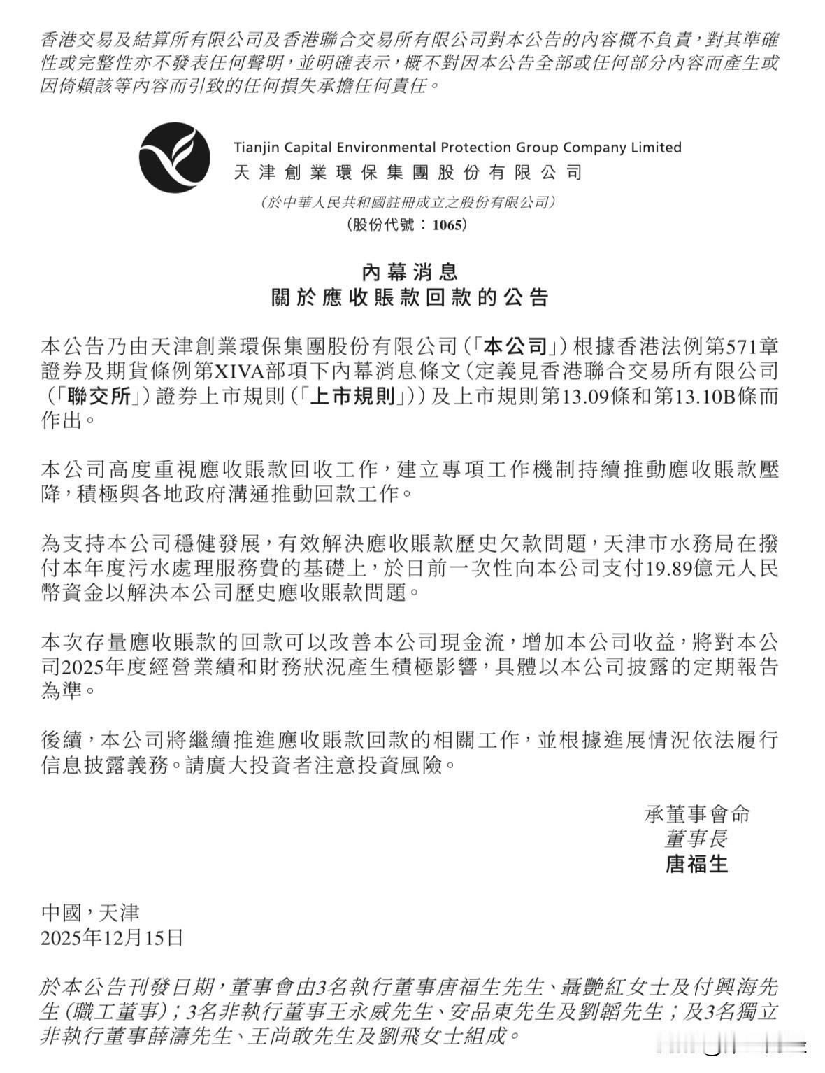天津市水利局大手笔支付19.89亿! 12月15日,天津创业环保股份突然甩出一则重磅公告。天津市水务局刚刚给他们打了一笔巨款,整整19.89亿元!这笔钱可不是普通的污水处理服务费,而是专门用来“清账”,解决公司积压已久的历史应收账款问题。 说白了,就是政府给企业送来了一场“及时雨”,把过去欠的“旧账”一次性结清。对于天津创业环保来说,这简直是雪中送炭。长期被应收账款拖累的他们,终于能松口气了。公告里说,这19.89亿将直接充实公司现金流,相当于给企业注入了一针“强心剂”,不仅能缓解资金周转压力,还能直接提升收益水平。 想想看,作为天津及周边地区污水处理的主力军,天津创业环保天天忙着处理污水,结果钱却收不回来,这谁受得了?现在好了,水务局这次“豪气”支付,不仅解决了历史遗留问题,更给企业未来的发展铺了路。无论是扩大业务规模,还是升级污水处理技术,都有了更充足的“弹药”。 公司方面也直言不讳,这笔钱对2025年全年的业绩和财务状况绝对是“大利好”。不过具体能带来多少收益,还得等之后的定期报告才能揭晓。 这几年天津在水利和环保领域的投入肉眼可见,这次19.89亿的专项支付,更像是一个信号。政府不仅舍得花钱搞建设,更愿意通过实实在在的支持,帮环保企业卸下包袱、轻装上阵。对于天津创业环保而言,这场“及时雨”下得正是时候,或许将开启他们新一轮的增长周期。 (注:本文内容根据天津创业环保公告整理,具体财务影响以公司官方财报为准)