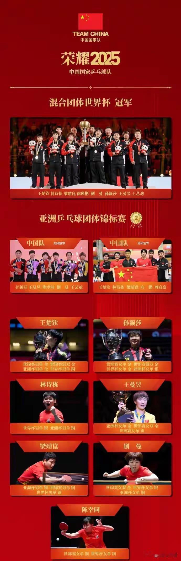 2025国乒金牌榜: 一、成都混合团体世界杯冠军 二、亚洲乒乓球团体锦标赛男团冠军 三、亚洲乒乓球团体锦标赛女团冠军 四、男子单打金牌王楚钦 世锦赛男单金牌、亚洲杯男单金牌 五、女子单打金牌孙颖莎 世锦赛女单金牌、世界杯女单金牌 六、女子单打金牌王曼昱 亚洲杯女单金牌 七、女子双打金牌 世锦赛女双金牌王曼昱/蒯曼 八、混合双打金牌 世锦赛混双金牌王楚钦/孙颖莎 中国国家队总结了中国乒乓球队在今年的荣耀,表示这份荣耀属于每一位国乒队员的付出!
