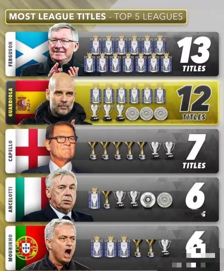 五大联赛主教练冠军排行榜。 这么看来,瓜迪奥拉确实厉害,超越弗格森只是时间问题,