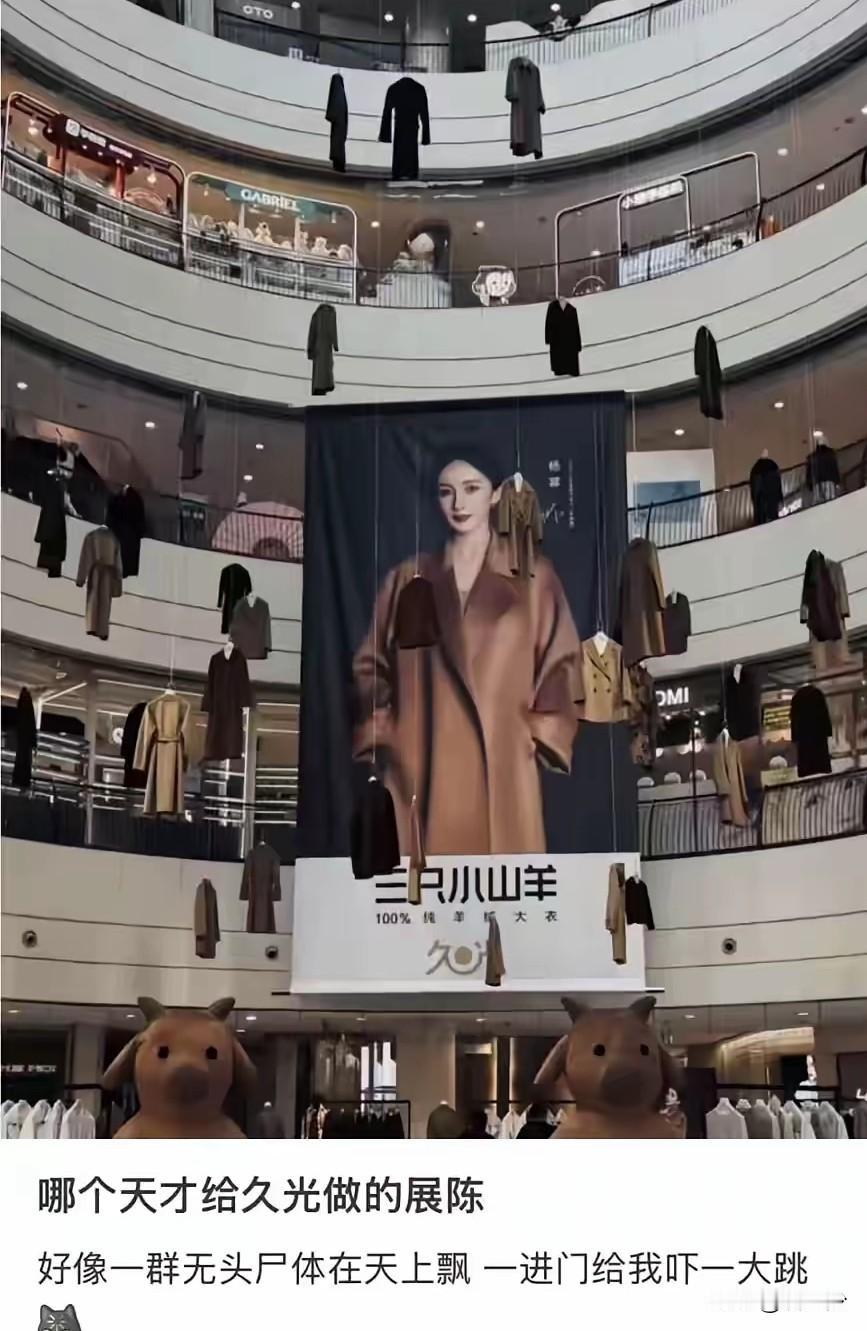 这下大家都知道了“三只小山羊”了[尬笑]!就是它在上海静安久光百货服装展摆出了非常诡异的“悬衣阵”。 它们在商场做营销展示,数十件大衣高矮不一的悬挂在商场上方,中间还挂着以杨幂为代言人的巨幅海报。 乍一看,让人看了感觉非常不舒服。 这一幕也引发了网友的热议。 有的网友说:这种风格像日系风格,还有点类似798艺术馆。 有的网友说:推广团队脑子里少了民俗禁忌的意识,说白了,就是缺少对中国传统民俗的认知。无知者无畏,作吧。 有的网友说:别把别人当傻子,甭管黑还是红,你就说这个品牌这下出名了么? …… 大家说这到底是个什么样的人能想出这么样的营销策略,杨幂看了不觉得有点发毛么[尬笑]。