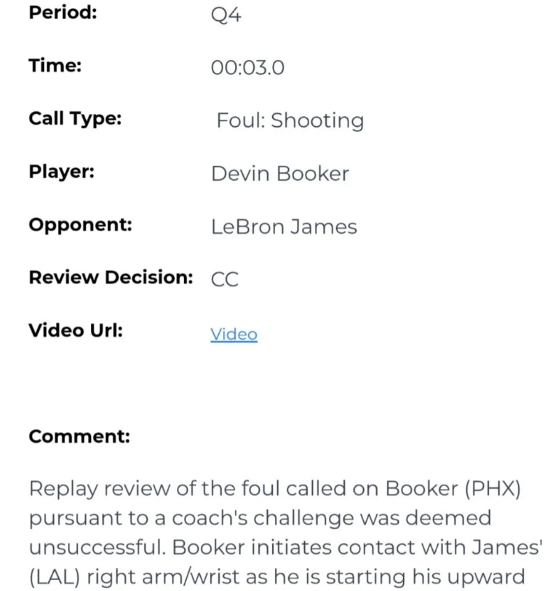 第四节剩3秒,布克对詹姆斯三分投篮犯规,经教练挑战启动犯规回看确认,布克在詹姆斯投篮的出手阶段,主动与其右臂/手腕发生身体接触,挑战失败,维持判罚
