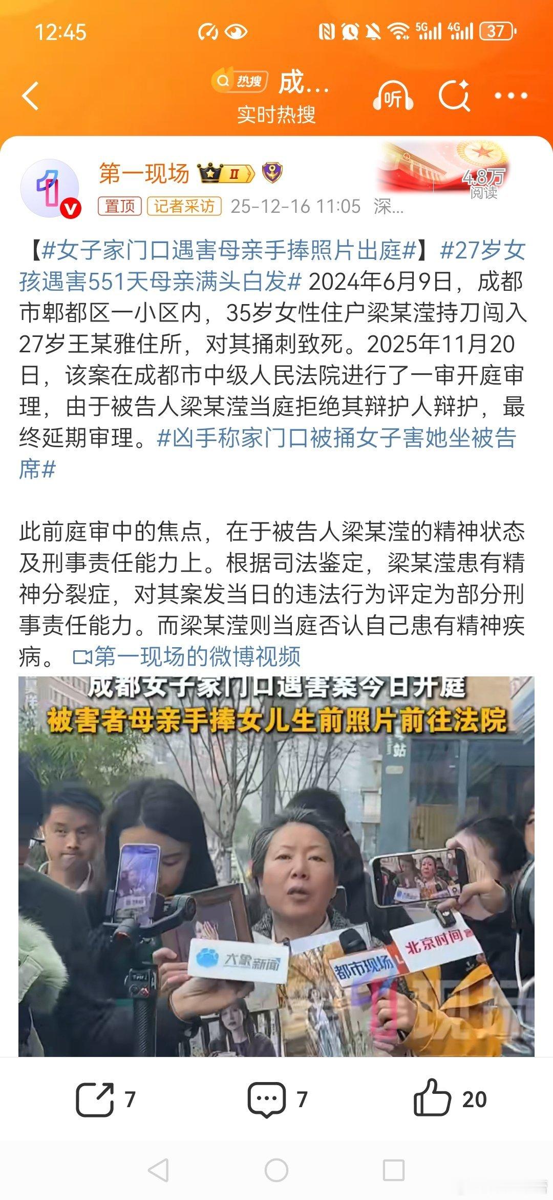 27岁女孩遇害551天母亲满头白发凶手称家门口被捅女子害她坐被告席】女子家门口遇害近600天母亲再发声理解为这位母亲的心情。但请其控制好情绪,给其做好心理疏导,让其相信法院判决,也不要一直采访它,让她陷入痛苦, 遇到精神病人还是要躲,不要正面冲突,自己的命最重要,精神病人只要还没有完全丧失刑事责任能力,就绝不是“法外之人”,仍要对其罪行担责,只是“可以”从轻减轻处罚,而不是必然从轻减轻处罚,更不是免死金牌。即使不能判处死刑,也不能一放了之,要严格强制医疗。