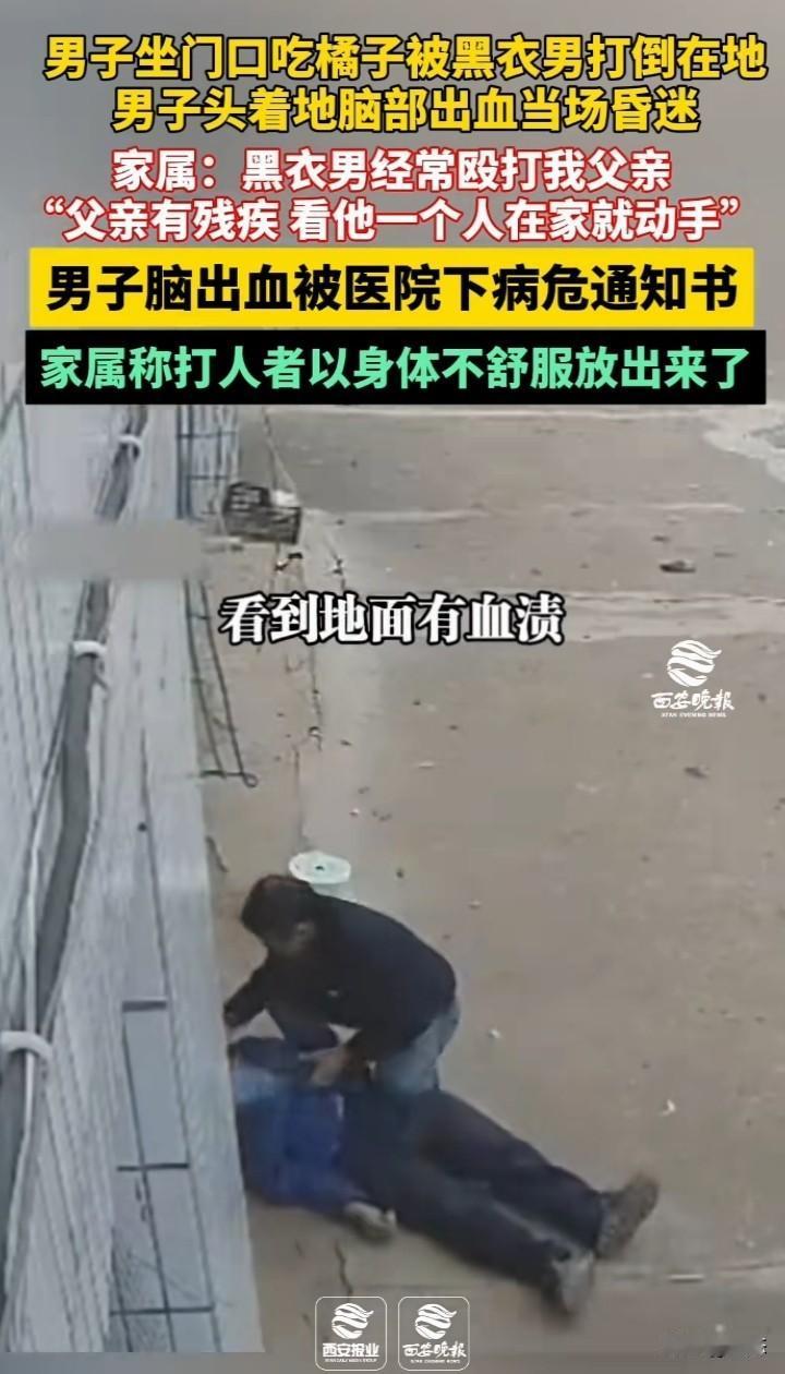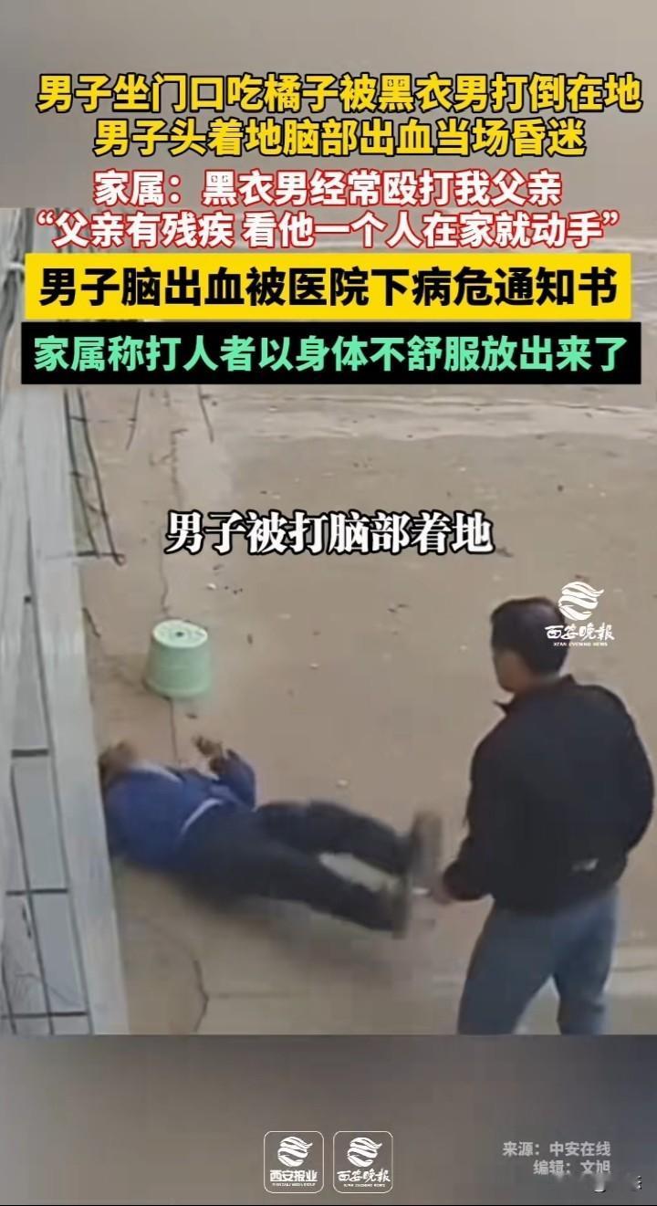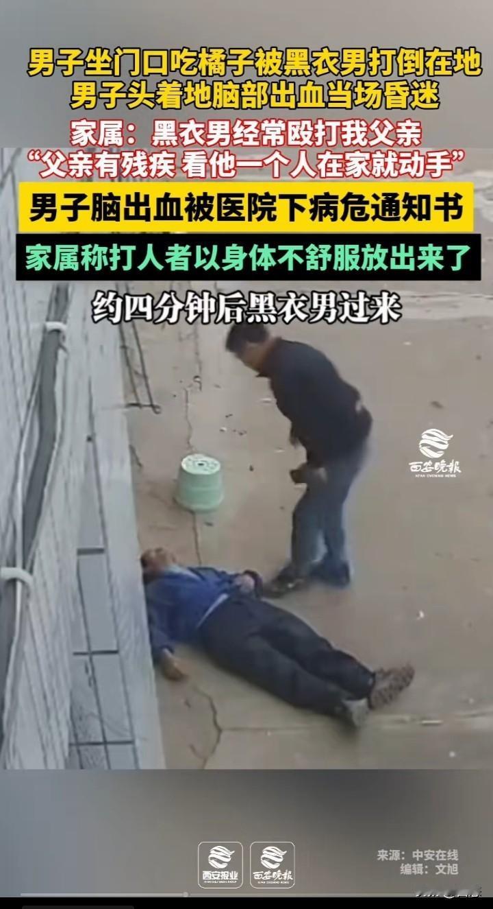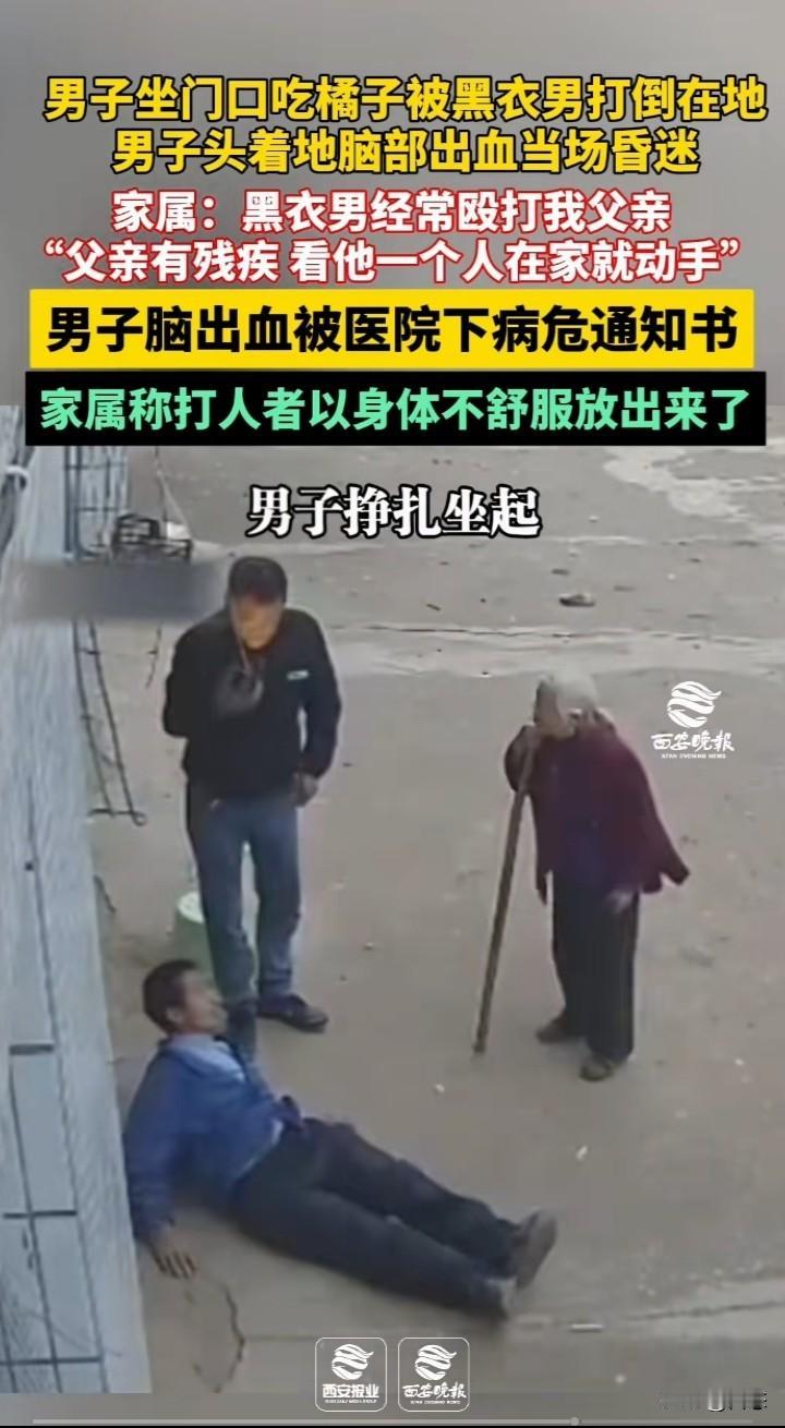 不敢相信,一男子坐门口吃橘子,男子看到黑衣男子过来,立马起身。黑衣男子过来就是给男子一拳,男子倒地,后脑勺着地。男子后脑勺有血迹,昏迷不醒,黑衣男子看到男子很久不醒才想拨打电话,老太太不让打电话。后面男子挣扎坐起。 男子的家属称,黑衣男子经常殴打他父亲,他父亲是个残疾人,看他一个人就动手打人。 男子由于后脑勺着地出血已经下了病危通知书,希望能好起来。 家属称打人男子由于不舒服就放了出来。 看到这世界上怎么会有这样的,想不明白为什么要殴打一个残疾人,不知道是不是两人有什么过节。就算有过节,打人肯定是不对的。 希望严惩不贷!给受害者一个交代。 你们怎么看呢?这黑衣男子太坏了吧?