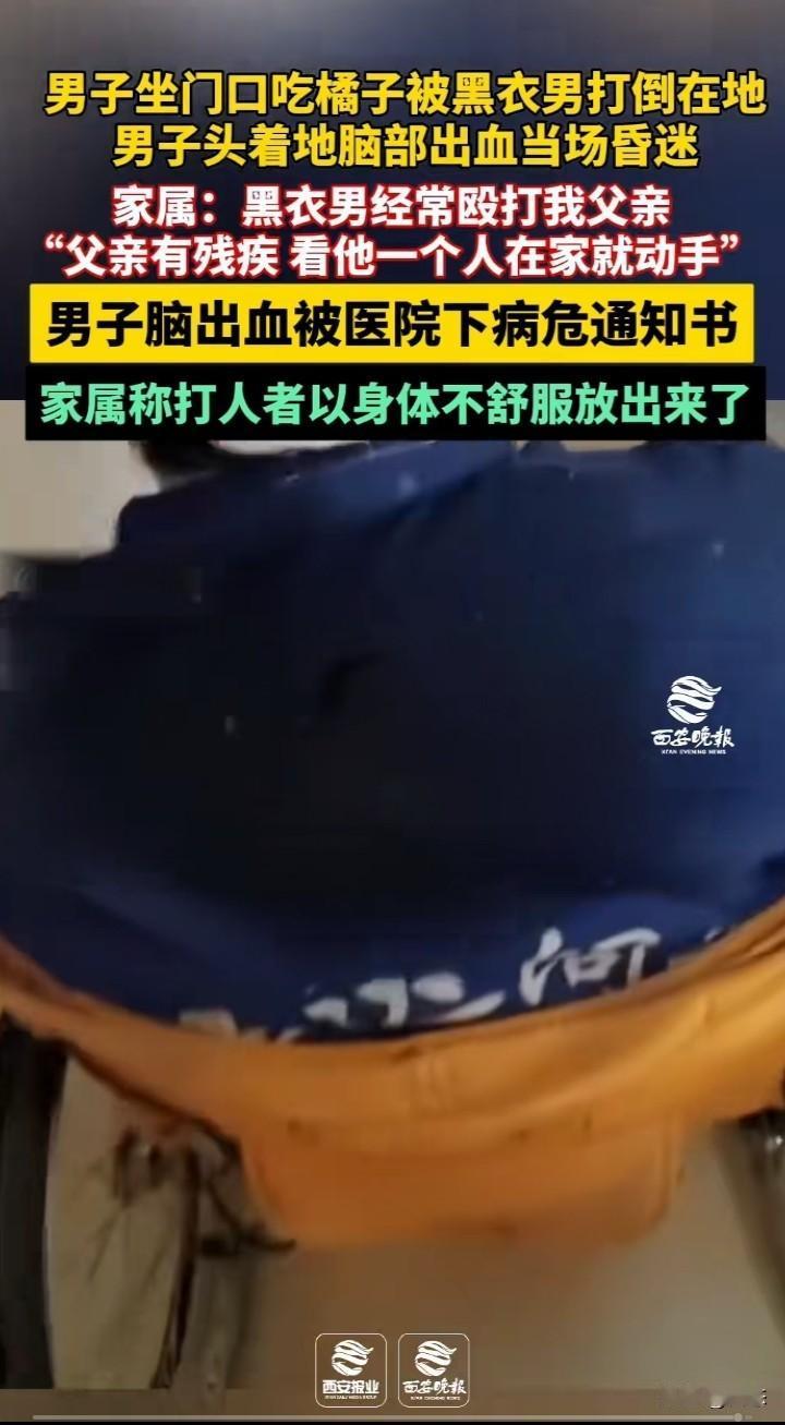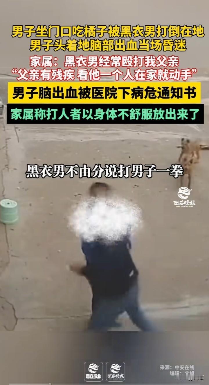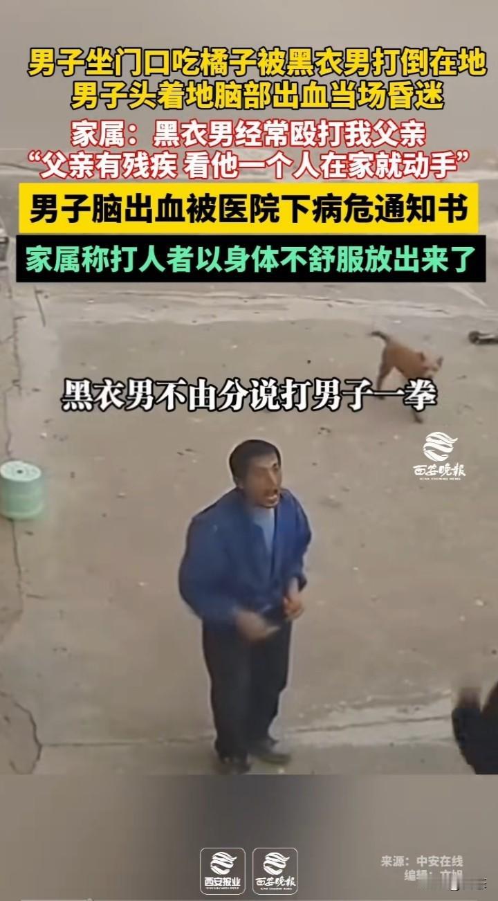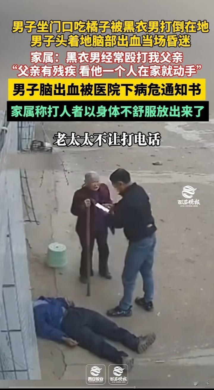 不敢相信,一男子坐门口吃橘子,男子看到黑衣男子过来,立马起身。黑衣男子过来就是给男子一拳,男子倒地,后脑勺着地。男子后脑勺有血迹,昏迷不醒,黑衣男子看到男子很久不醒才想拨打电话,老太太不让打电话。后面男子挣扎坐起。 男子的家属称,黑衣男子经常殴打他父亲,他父亲是个残疾人,看他一个人就动手打人。 男子由于后脑勺着地出血已经下了病危通知书,希望能好起来。 家属称打人男子由于不舒服就放了出来。 看到这世界上怎么会有这样的,想不明白为什么要殴打一个残疾人,不知道是不是两人有什么过节。就算有过节,打人肯定是不对的。 希望严惩不贷!给受害者一个交代。 你们怎么看呢?这黑衣男子太坏了吧?