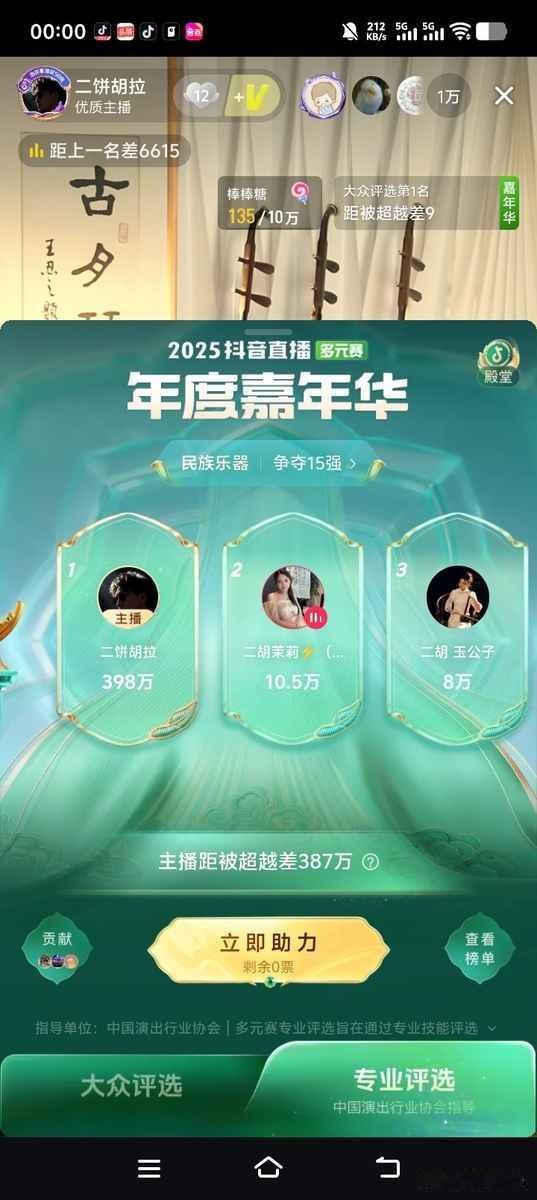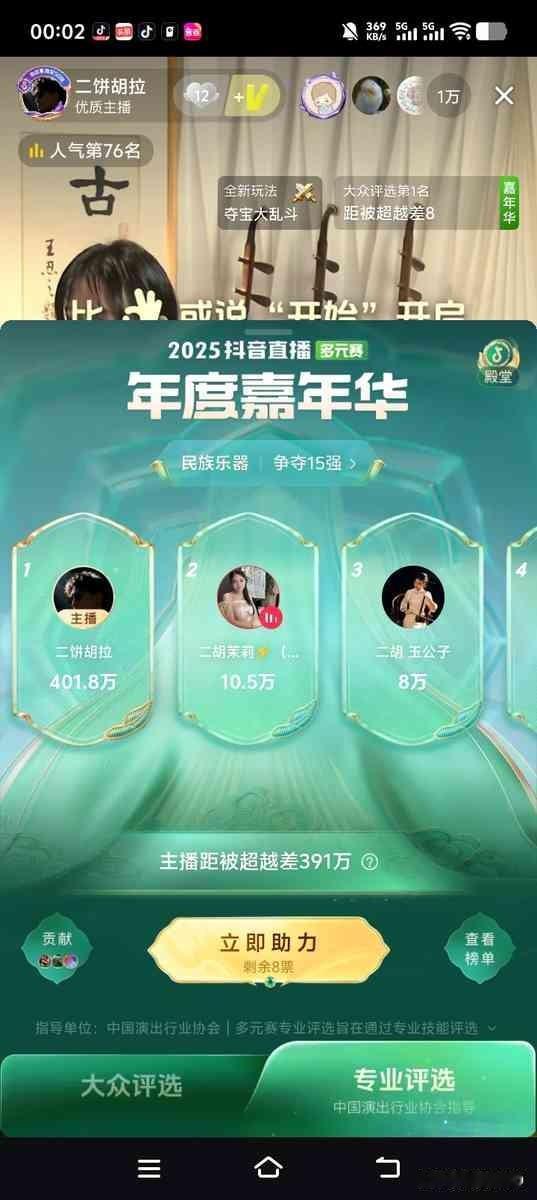 开场票数401.8万,第二名才10.5万。 比赛还没比,奖杯好像已经在他家柜子里落灰了。 你可能刷到过那个叫二饼力哥的主播。昨晚一场直播PK,他和搭档的电二胡表演确实惊艳。但真正让人愣住的,是票数榜。他一个人的票,是第二名的40倍。这哪是比赛?这像是职业选手误入了小区运动会。 但最绝的还不是这个碾压局。是他明明稳赢了,还在那儿一丝不苟地排练《海阔天空》,琢磨着怎么精益求精。这就好比考试提前一小时交卷,还坐在那儿把草稿纸上的解题步骤誊写得工工整整。 所以,我们看的到底是啥?是一个毫无悬念的结果,还是一个人对“赢”这件事的重新定义?当胜利变得唾手可得,真正的对手就只剩下自己了。他打败的从来不是榜单上那几个名字,而是那个“差不多得了”的念头。 这不是内卷,这是内驱。