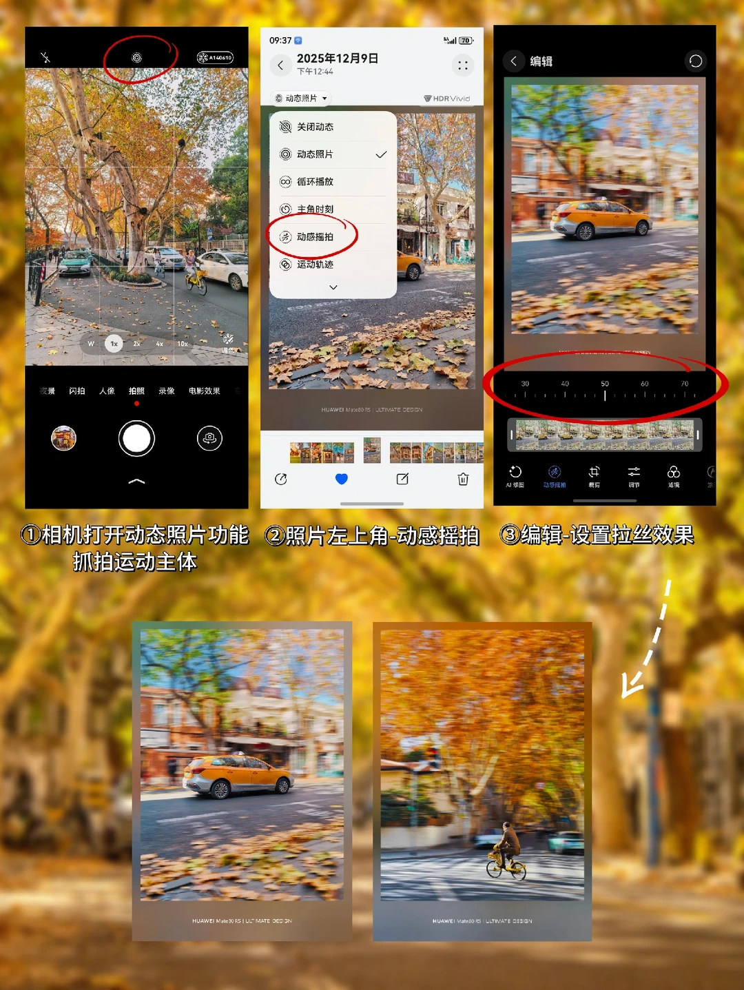 ❸这次我带的街拍神器华为Mate 80 RS 非凡大师,“先定格,再定风格”,前期只需抓拍运动中的物体,想要同款动感拉丝效果,无需专业设备跟踪拍摄,后期打开相机的动态照片功能,进入“编辑-动感摇拍”,可以手动微调拉丝强度,营造不同氛围感,轻松get街拍大片!还可以打开AI辅助构图,只需要对准取景主体,就能自动切换拍摄焦段,智能构图,拍照再也不会被女朋友骂了!