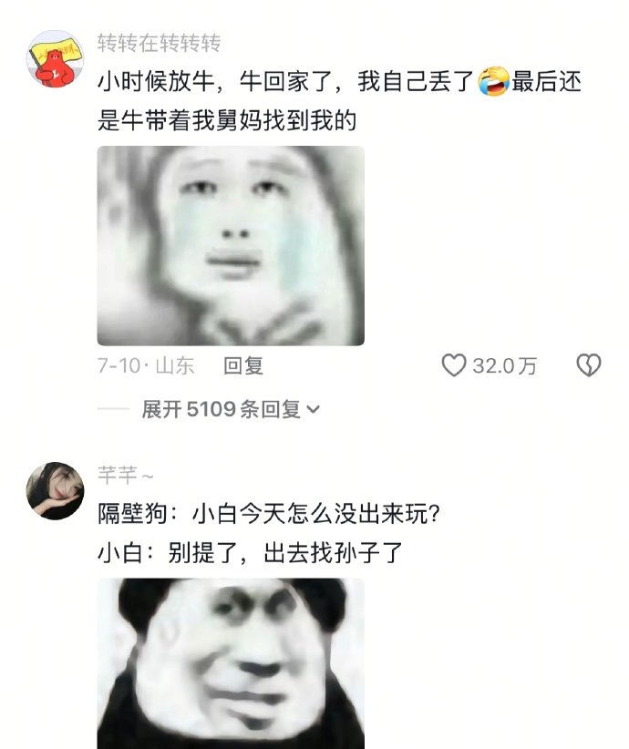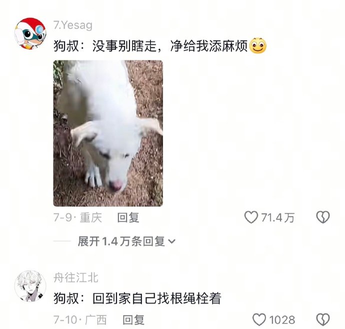 隔壁狗:小白今天怎么没出来玩? 小白:别提了,出去找孙子了
