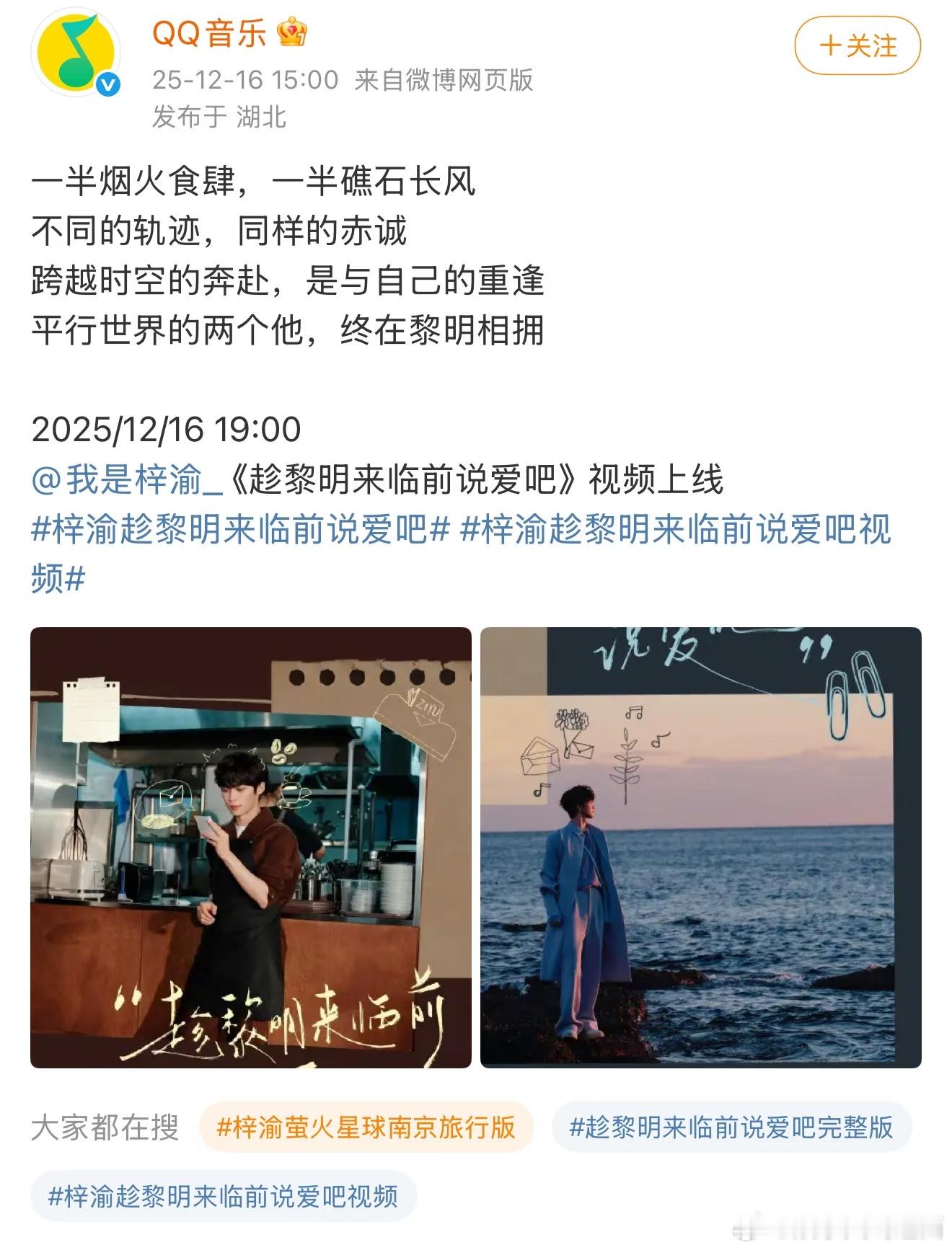 梓渝解锁平行时空里的隐忍与热烈困顿与奔赴打工皇帝郑朋x闪耀大明星梓渝是郑朋和梓渝的故事,光看这个文案就很受触动,热烈的梦想赤忱的心,梓渝等你说出你追梦的故事,《趁黎明来临前说爱吧》视频今晚19:00正式上线🎤