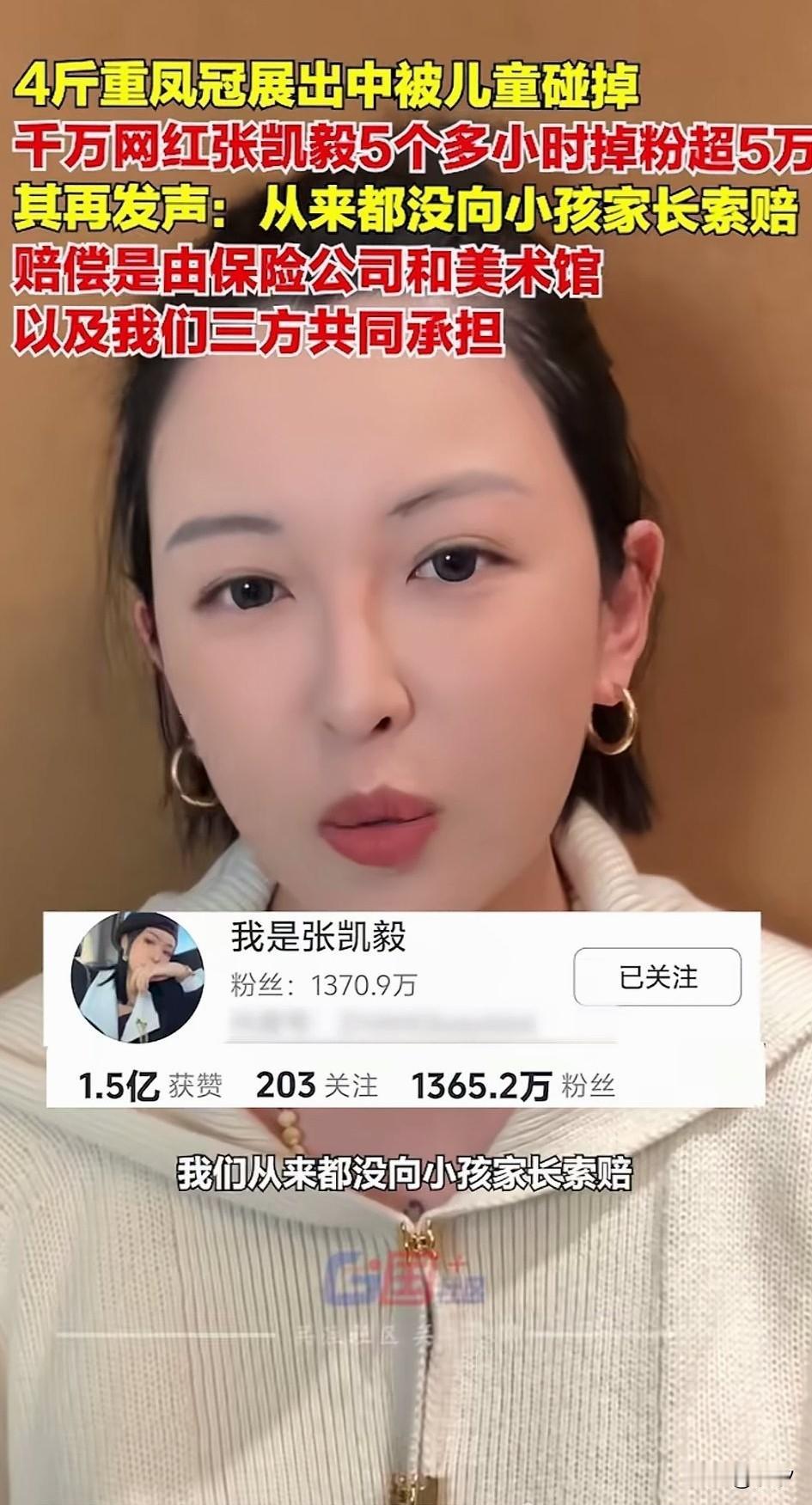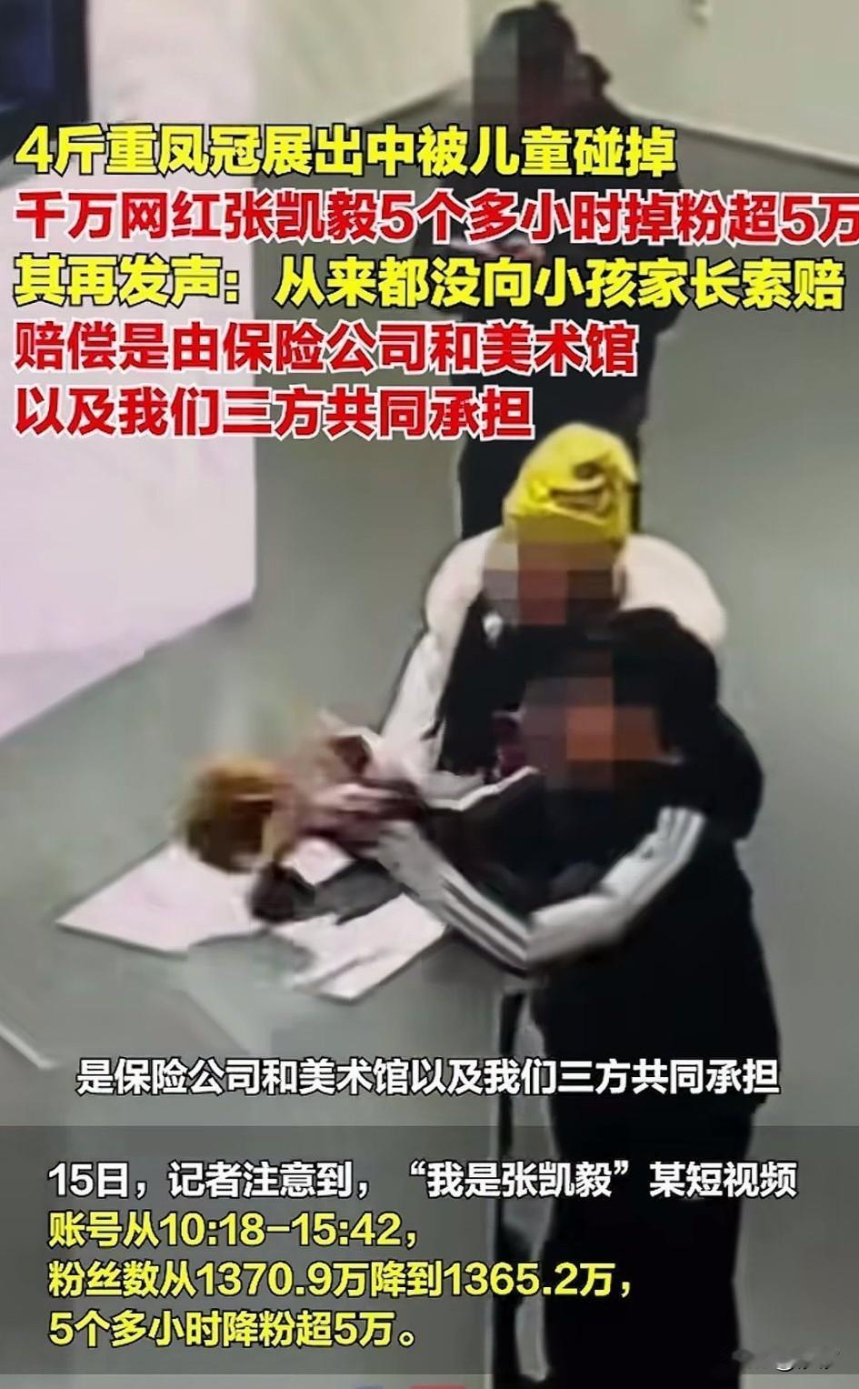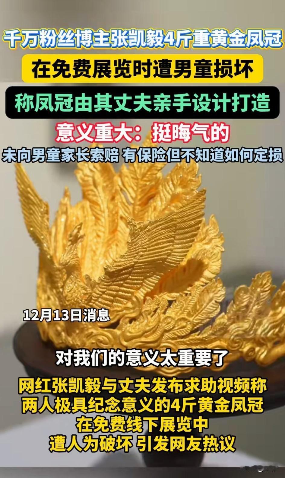 四斤重的凤冠展出中被儿童碰掉, 我是张凯毅的老公结婚时给她打造的, 她在视频中表示真是晦气, 可以看到视频中, 一女子先接近观看, 随后一个小朋友上前查看, 出于好奇就用手碰了一下, 结果展览中的凤冠直接掉落在地上, 凤冠表面是由罩子罩住的, 没想到碰一下就掉了, 负责展览的工作人员肯定有责任, 为什么罩子不固定好, 看到这种情况后, 孩子的家长也是吓坏了, 博主可能是为了流量, 在网上寻求网友的帮助, 问网友如何能够修复她, 结果这事被她的粉丝认为是在内涵他们,于是她的账号5个小时脱粉五万人, 她本身也因为这事陷入舆论漩涡, 很多博主觉得她平时炫富也就罢了, 居然还问没有她经济条件好的网友这种问题,是老凡尔赛了, 她本人也吓的发视频解释, 自己是真心向网友求教, 并不是内涵自己的粉丝, 而且自己也从没要求孩子的父母赔偿, 这期间的损失是由保险公司负责赔偿的,况且这个展览是自己免费办的, 大家对于网红四斤重的凤冠被小朋友碰坏怎么看? 婚姻与家庭 你知道的大网红都有谁 非遗凤冠 结婚凤冠 故宫凤冠 凤冠拼图 凤冠现场