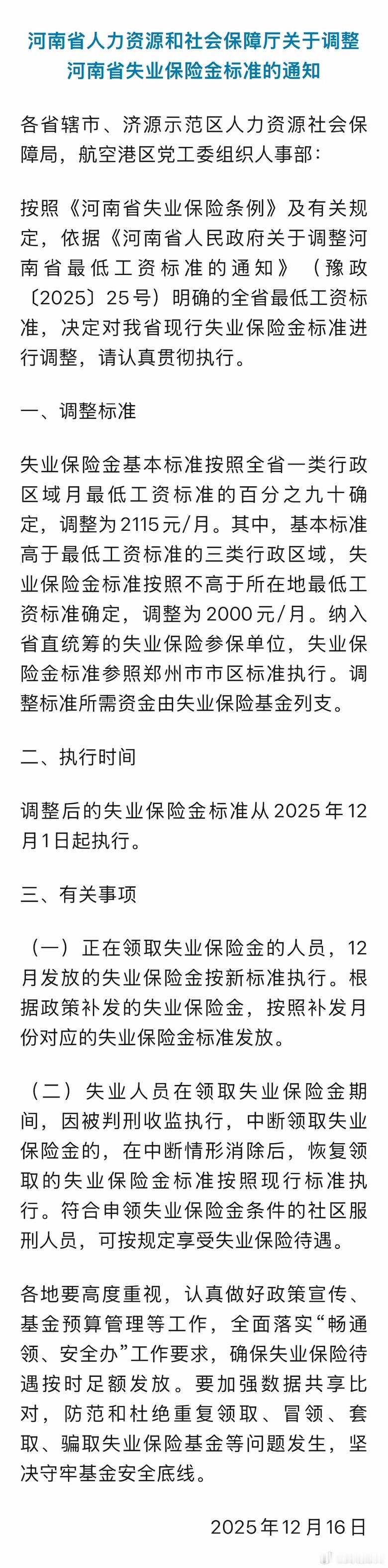 河南失业保险金标准提高了 12月16日,河南省人力资源和社会保障厅发布通知,对河南省现行失业保险金标准进行调整。调整后的失业保险金标准从2025年12月1日起执行。根据通知,失业保险金基本标准按照全省一类行政区域月最低工资标准的百分之九十确定,调整为2115元/月。其中,基本标准高于最低工资标准的三类行政区域,失业保险金标准按照不高于所在地最低工资标准确定,调整为2000元/月。纳入省直统筹的失业保险参保单位,失业保险金标准参照郑州市市区标准执行。调整标准所需资金由失业保险基金列支。元旦请3休8
