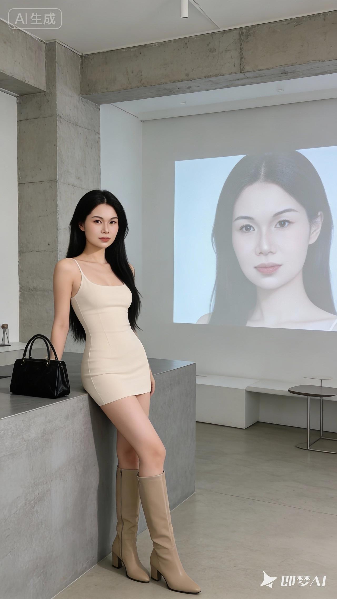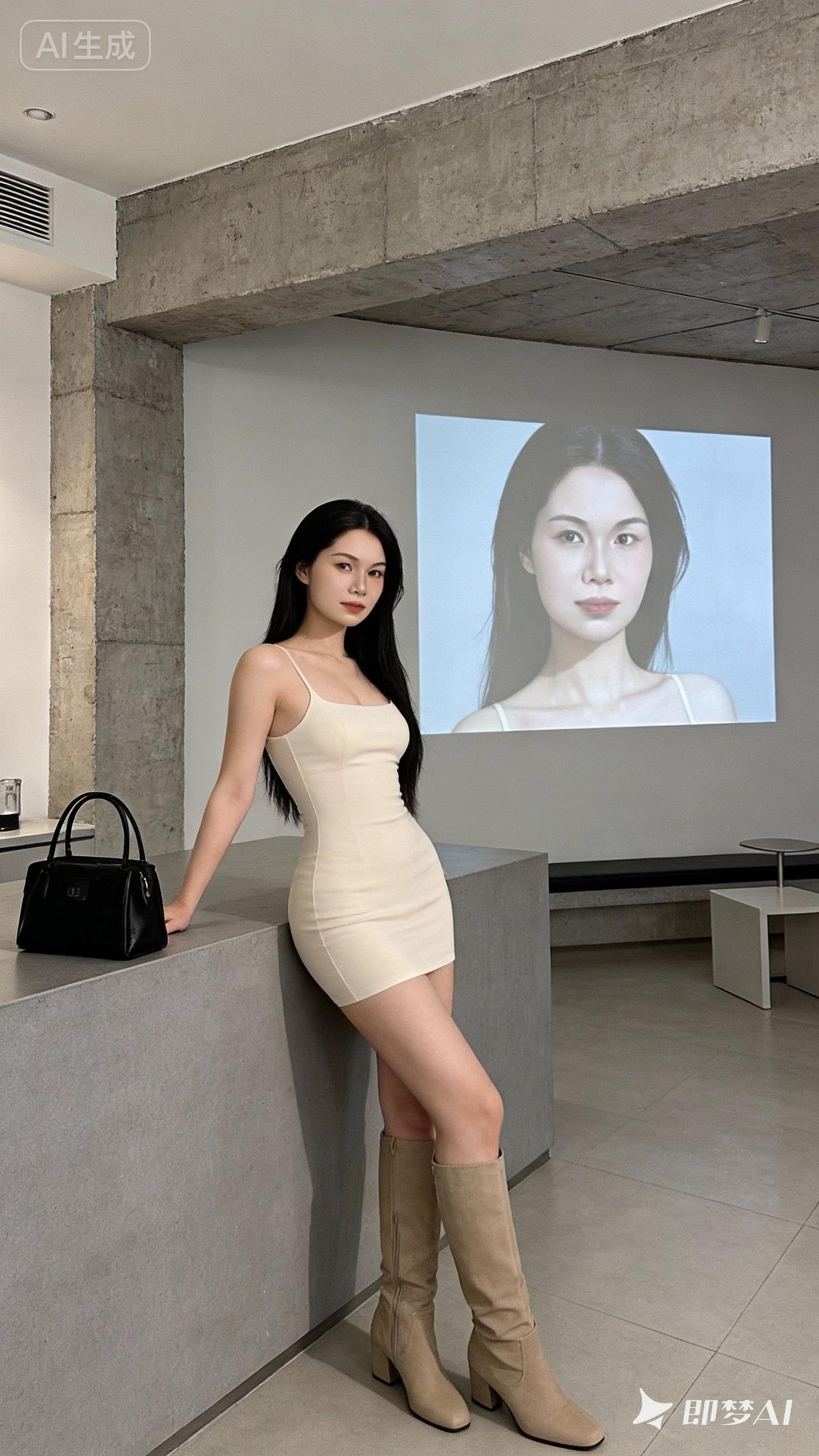 一位高挑高颜值美女,高领长袖针织短款包臀裙,冷白皮肤,皮肤白皙细腻,身材高挑完美