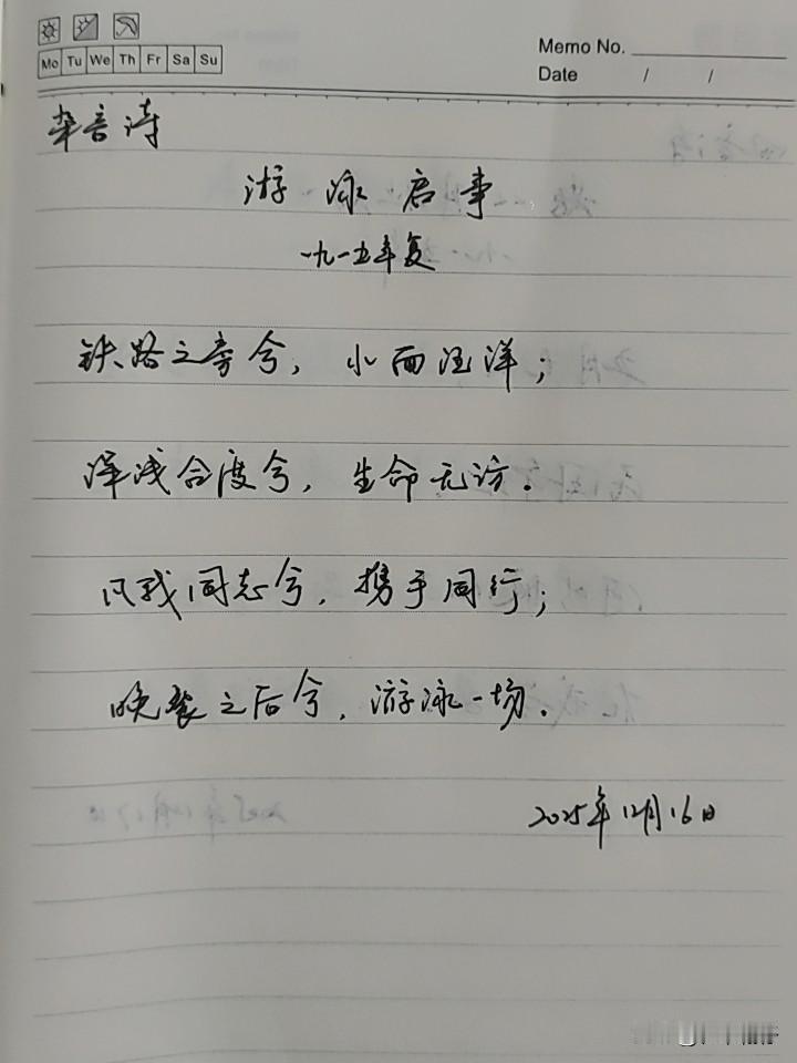 抄书第 1032天(2025年12月16日) 静心✔ 戒浮躁,一笔一划。 今天抄《毛泽东诗词》之《杂言诗·游泳启事》,这是毛泽东青年时期为组织同学游泳而创作的一首别致小诗。 这是一则校内启事。毛泽东当时担任校友会干部,为了动员更多同学参加游泳锻炼,特意用这种生动押韵的形式张贴出来,效果很好,吸引了许多同学参与。游泳是贯穿毛泽东一生的爱好,也成为其诗词中的重要主题和灵感来源。 自抄诗词 抄抄书 练练字 静静心