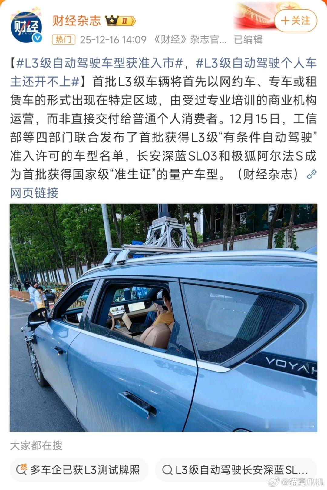 主要是因为L3的牌照有三类,前天公布的是toB的商用牌照,估计会在一些网约车上看到。其他的还有测试牌照,和toC的拍照。测试拍照早就有了,不然也不会今天L3的正式商用了。不过应该也快了。L3级自动驾驶个人车主还开不上