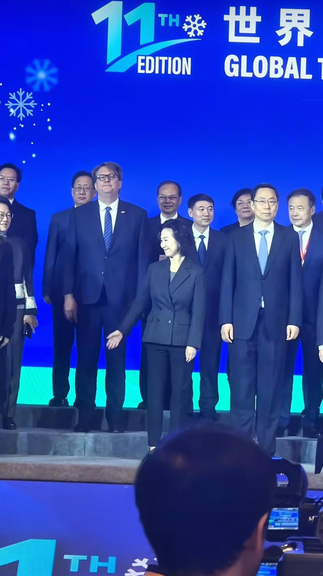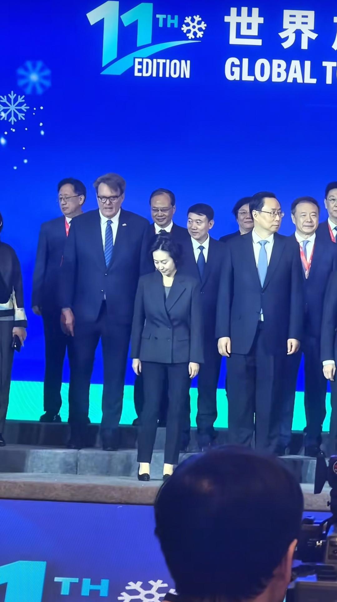 12月16日,在世界旅游经济发展论坛会上,嘉宾们要进行合影,何超琼女士参加合影活动,被工作人员安排在前排中间位置。 何超琼穿着一身正装,衣品看起来很端庄,西装上衣设计的是两排扣子,看起来很修身,尽管没有戴昂贵的首饰,但气质优雅。 何超琼站好位置后,看到龙永图先生后,立刻面带微笑,伸手打招呼,龙永图站在了何超琼女士的右手边,两个人进行了简单交流。