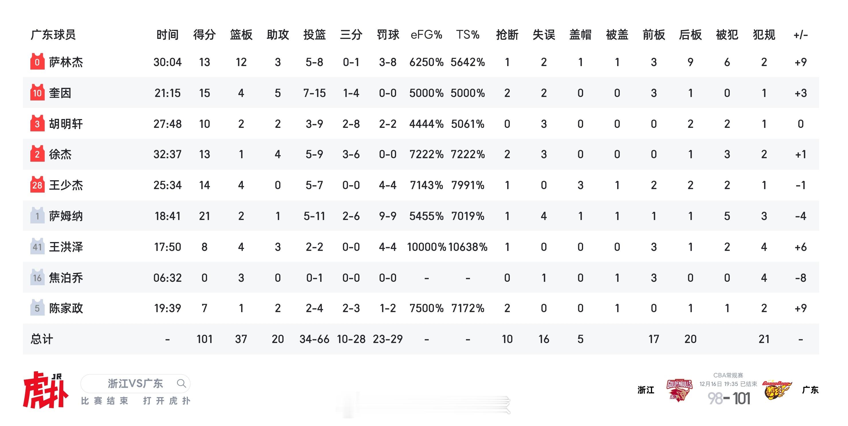 101-98,广东队有惊又险的拿下开赛两连胜。减少失误减少犯错,才能赢下更多比赛。新人王洪泽、陈家政是除去外援萨林杰之外本土球员里正负值最高的两人,在第二节陈家政命中两记三分强突造了个犯规,王洪泽在第二节也拿到了6分,广东队在这节建立8分的优势。广东男篮战胜浙江男篮
