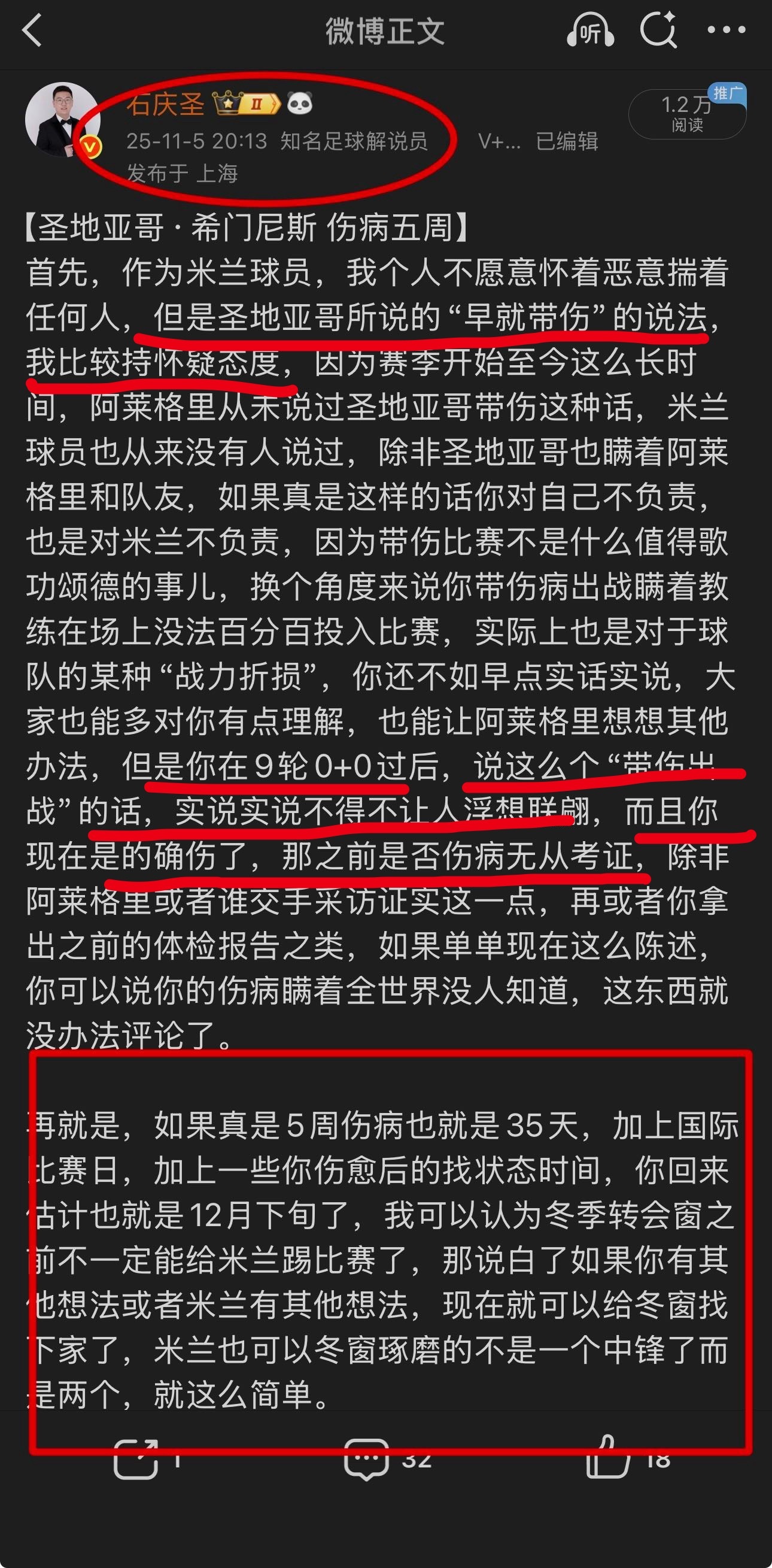 【悬赏】米兰现在挺好的,我年纪也大了,有些事儿我尽量不惜的搭理,保持基本“内部团结”,但是别TMD过于不要脸我不是好欺负的,你们某些博主被国米博主骑在头上拉屎的时候,没有我帮你们说几句话,你们像老鼠一样被人踩在角落忘了是吗?有些还算有点记忆,有的我不说是不是以为互联网没记忆了?我点到为止,好自为之。然后我说一下正事儿。第一,我没说过圣地亚哥亚特兰大崴脚后是诈伤,谁拿出来说了亚特兰大崴脚后“诈伤”的证据,奖励现金1万。我说的是——五周伤病,他冬季转会窗前不一定能给米兰踢比赛了,且如果双方有二心,就可以各自找下家了。第二,我质疑的是——圣地亚哥自己说,自己亚特兰大之前带伤作战。(我现在也认为他是找理由),谁能给拿出来圣地亚哥-希门尼斯之前带伤作战的证据,比如官方任何人员或者采访消息说他“之前带伤作战”,我奖励1万。我愿意花一万块钱,证明我 米兰队医 墨西哥国家队队医算是大xx。第三,你知道我为什么最近自己有时间或者没时间就让助手搬运新闻吗?因为我想让某些国内外的记者或者博主知道,搬运新闻别认为有什么门槛,毫无门槛,就是我想不想做的事,我只要想做一定可以做,甚至比你们做得好,因为我以足球为工作,只要愿意,我加助理可以24小时搬运,你们行吗?搬运新闻别搬运出来优越感,更不可能卖钱,任何平台分分钟给你抄走,抄袭问题也是为什么我之前不愿意做的原因,APP看就完了。第四,我能靠米兰赚钱,是因为PP 咪咕给我的机会和我多年行业的坚持,米兰好与不好我都在用心解说,不像有些人米兰好的时候才讨论,不好的时候只字不提,这是我发自肺腑对米兰的热爱坚守,以及我每周四五个小时直播带来的情绪价值,还有我真诚为为我付费的用户负责的态度,不管是观赛团还是v+会员,他们花这个钱花的值才有人买,而不是整天“毫无逻辑”的分析,做一个“虚伪的人”,人最重要的需要知道自己能干什么,不能干什么。最后,我再说一遍,我喜欢自己玩儿自己的,你们有些博主也好球迷也好,你就默认我在放屁,我狗屁不懂,你们最牛逼,你们掌握真理,你们有内幕消息。我只知道我所有的评论都是前瞻性的,事实无数次证明过,我就不举例子了因为太多了,所有人,愿意看我的就看我,不愿意看的就滚,拉黑我。大圣聊球大圣聊球大圣聊球大圣聊球