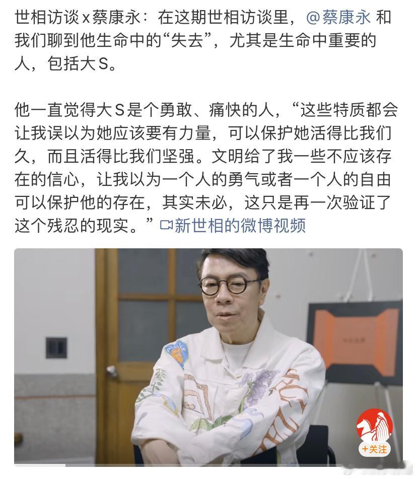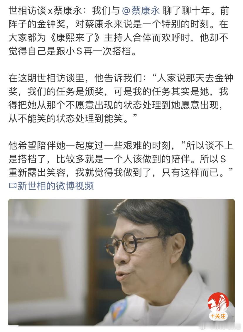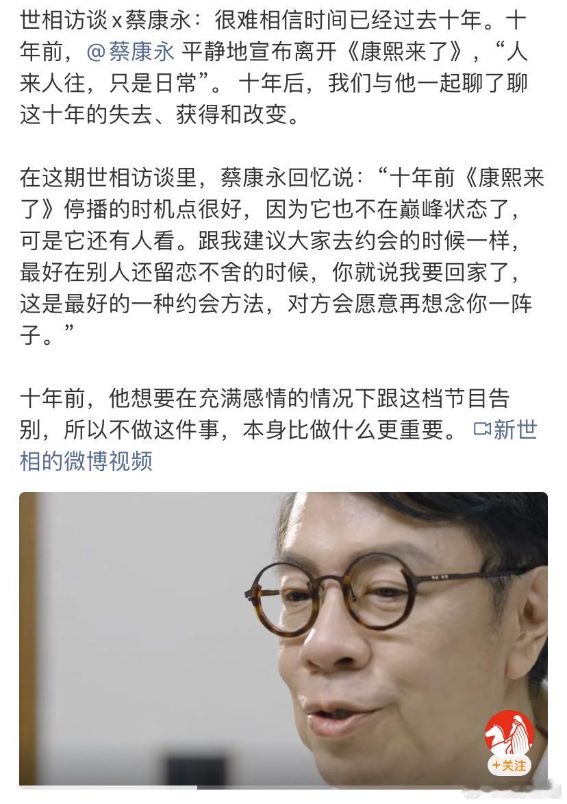 蔡康永谈康熙停播的十年十年间的变与不变:失去与冲击:曾深信“大S会活得比我们更久、更坚强”,但生死无常让他直面“勇气无法保护生命”的残酷真相。谈与小S的友谊:超越搭档的守护,金钟奖的托举“确保她重露笑容”。