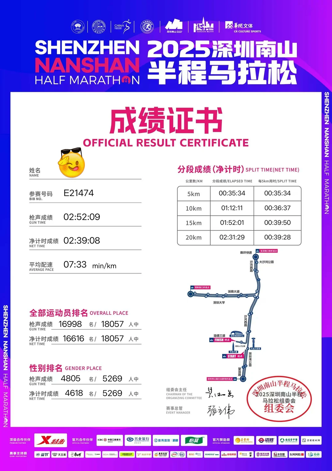 👍不得不说深圳南山半程马拉松的补给站做的很好,像我这种运动小白吃了能量胶喝了电解质水,身体简直打满能量就像大力水手吃了菠菜一样,长距离跑步身体也感受不到累,跑过了起步艰难的10公里,已经忘记了时间只管往前冲,最后拿到奖牌安全完赛那刻真的为自己感到骄傲!真的在自己的人生道路上,只要相信自己,就没什么做不到的!