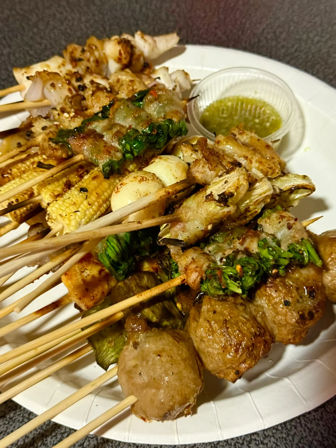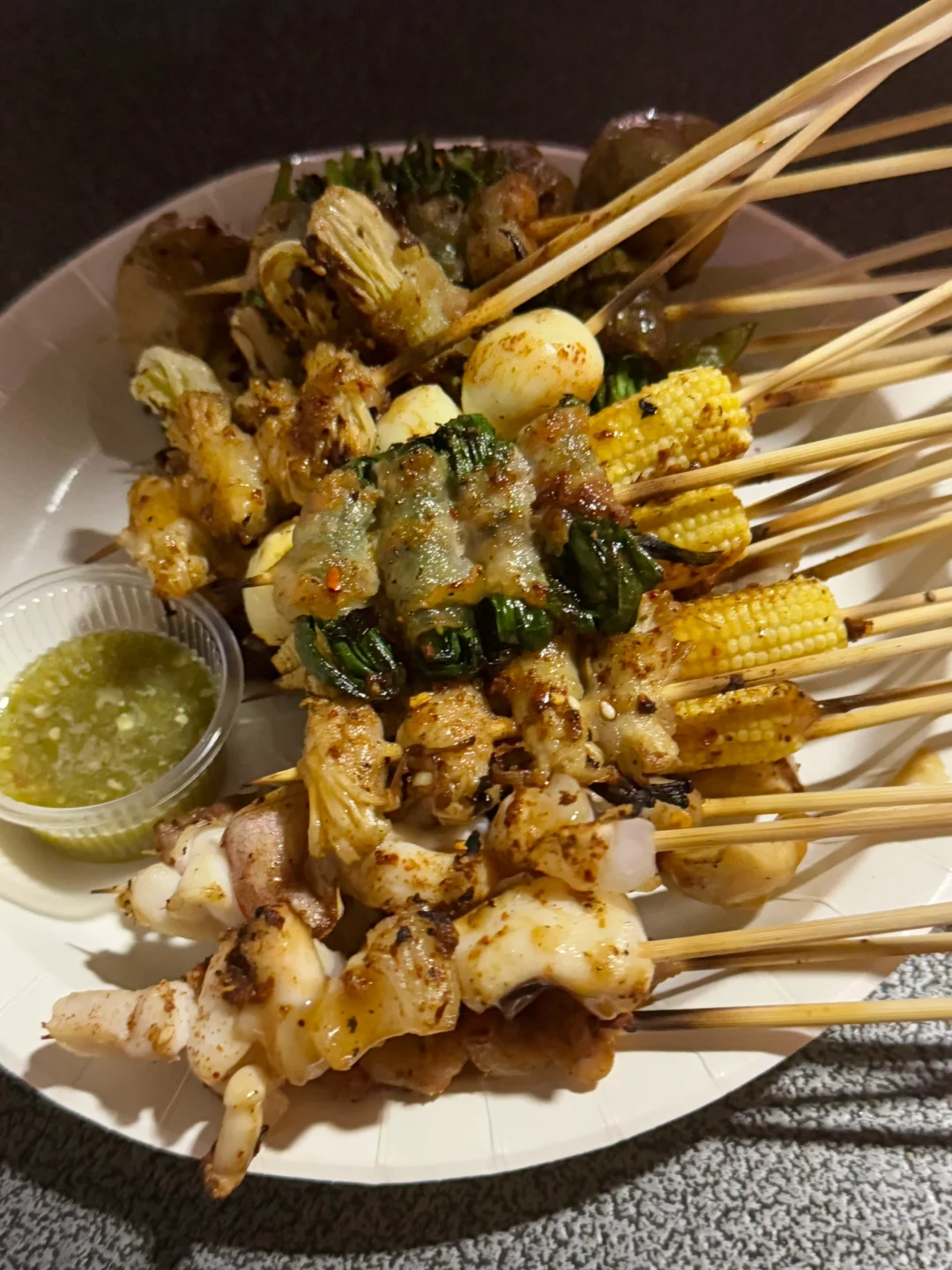 来清迈旅游吃了两次的烧烤摊,素菜5🐷一串,肉串10🐷一串,不能吃辣的姐妹就不要辣啦,可以单独要一碟辣椒粉!烤串配上特调的泰式辣酱好好吃啊!
