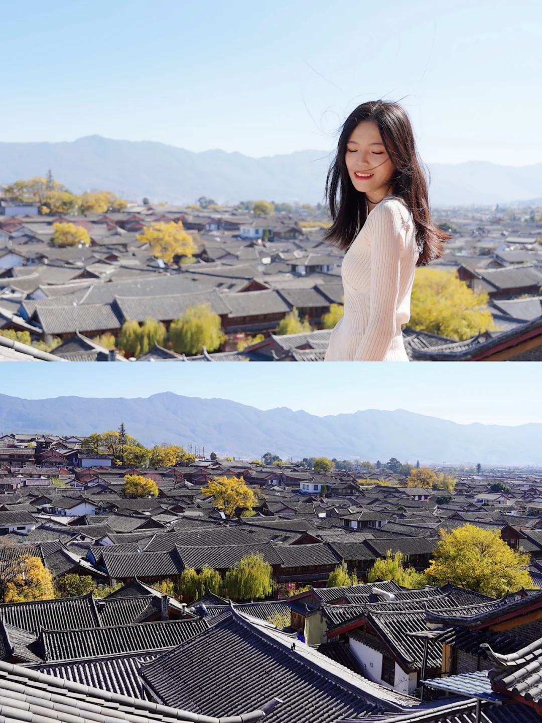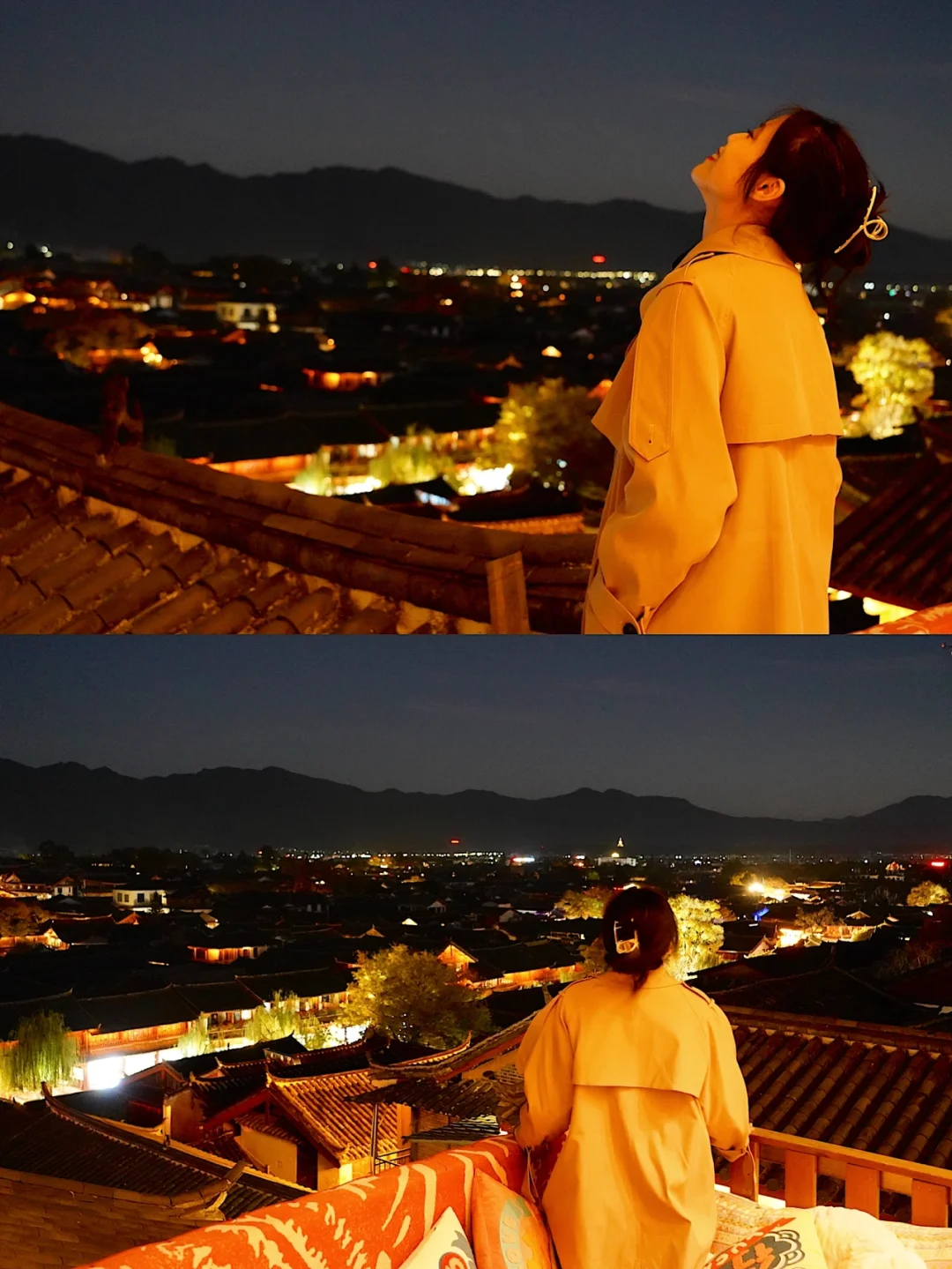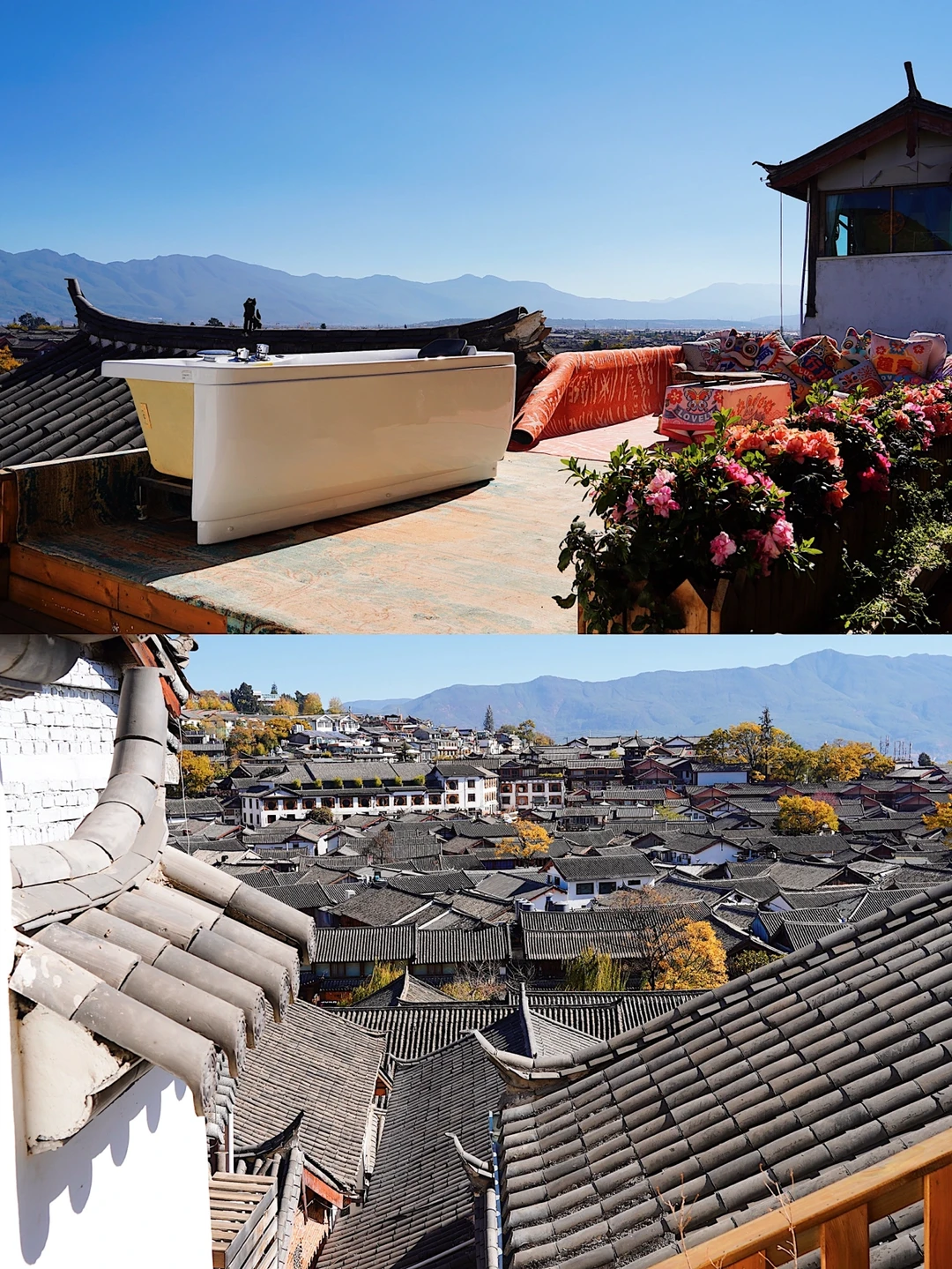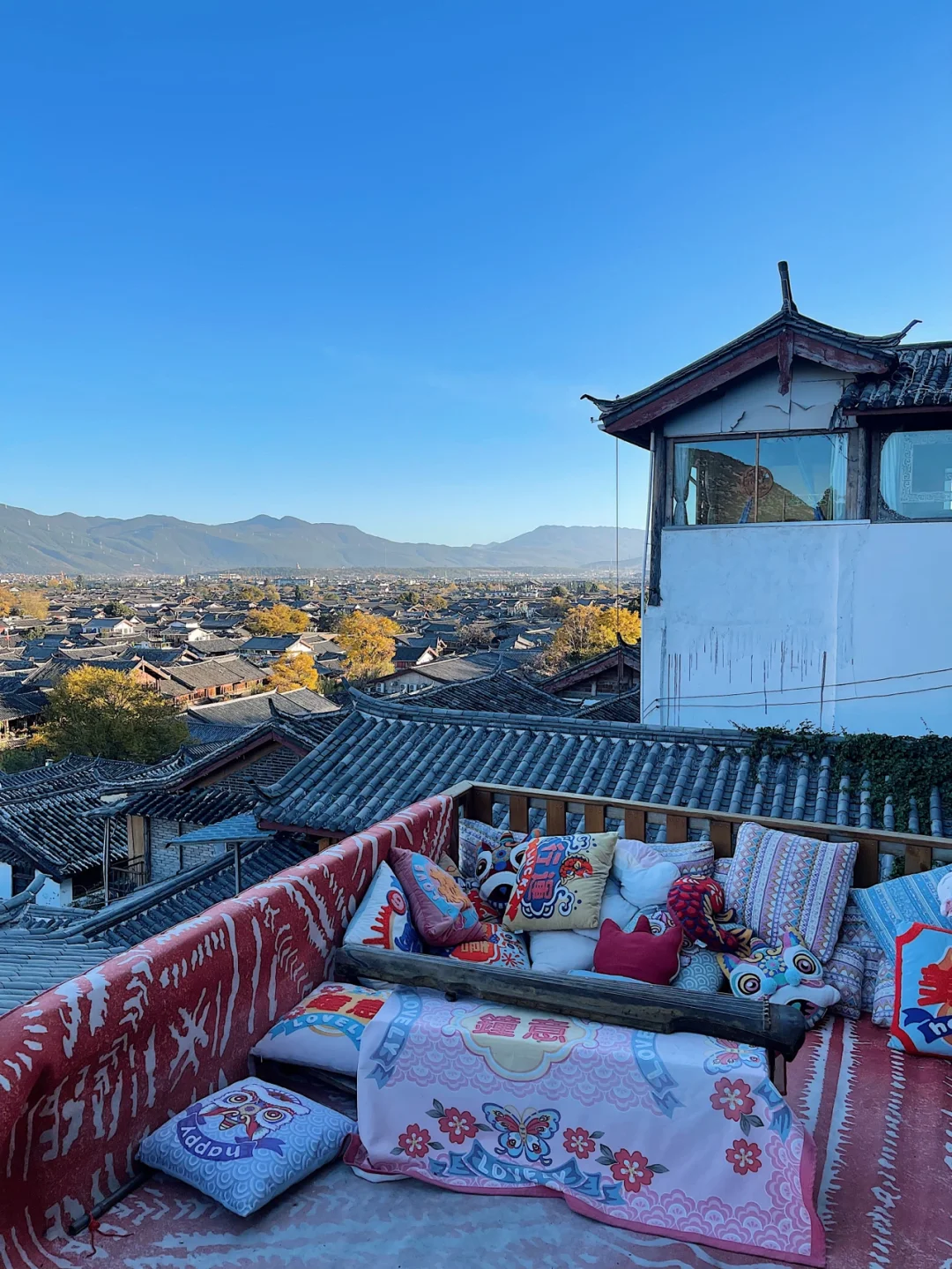 🌟预订的房间比我想象中小一些,放三个人的行李箱确实有点挤,但这个价格还要什么自行车呢?床品柔软舒服,基础设施卫生算是干净的,整顿完行李就上顶楼去拍照咯~在顶楼能俯瞰整个丽江古城的风景,还可以在网红摩洛哥风的观景台上拍照凹造型,无论你是日出还是日落过来欣赏风景,每一个时刻都有不同的美感‼️