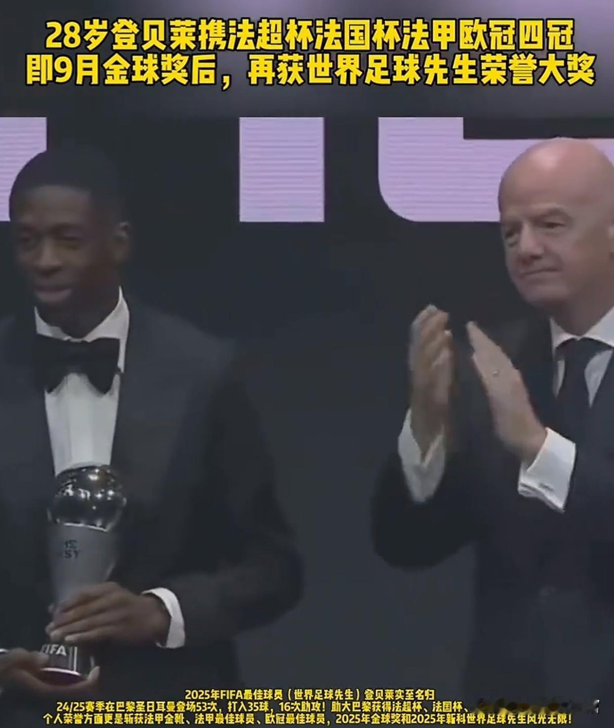 登贝莱当选FIFA年度最佳球员 当地时间12月16日,在卡塔尔多哈举行的2025年国际足联年度颁奖典礼上,法国的奥斯曼·登贝莱当选FIFA年度最佳男足球员,他也成了足坛首位获此殊荣的90后男子球员。 去年“00后”维尼修斯夺魁,“90后”罗德里无缘。今年候选里阿什拉夫、凯恩、姆巴佩等也都是90后,但最终登贝莱脱颖而出。他效力于巴黎圣日耳曼,在球场上的表现有目共睹。这次获奖是他足球生涯的高光时刻,也为90后球员证明了实力。期待他未来能继续带来精彩表现!