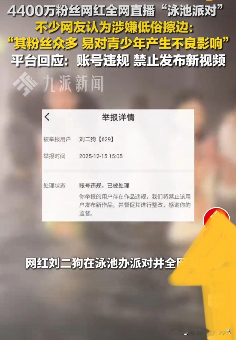 4400万粉大网红凉了!泳池直播擦边被封,镜头专盯敏感部位太辣眼 家人们快看大瓜!4400万粉丝的快手头部网红刘二狗,因为一场泳池派对直播彻底栽了!平台刚官宣处理结果,直接禁止他发新作品,这波真不冤! 12月初他搞的这场户外温泉直播,简直把“擦边”写在脸上!直播间里一群男女穿得特别暴露,女的泳衣几乎遮不住啥,还在水里互相拉扯嬉闹,镜头更是精准聚焦胸部、臀部,反复放大特写,就差明着博眼球了。更夸张的是,这场直播还连麦了快手一姐蛋蛋蹭热度,在线人数冲到244万,播放量破1.3亿,不知道带坏多少青少年! 网友们看得火大,满屏弹幕吐槽“四千万粉丝还靠露肉圈粉,太掉价”“明摆着违规,平台早该管了”!从12月5号直播到15号,网友举报了整整十天,平台才终于出手处理。要知道这不是刘二狗第一次作妖,之前还搞过“PK验资10万”的炫富闹剧,现在赚得盆满钵满(名下有上亿写字楼),反而越来越没底线! 现在中央网信办早有规定,严查直播“色、俗”乱象,刘二狗偏偏顶风作案。网红想长久,靠的是真本事不是无底线擦边,流量再大也不能触碰公序良俗!你们觉得这次处理够不够严?评论区聊聊~ 网红直播间封禁 网红二狗