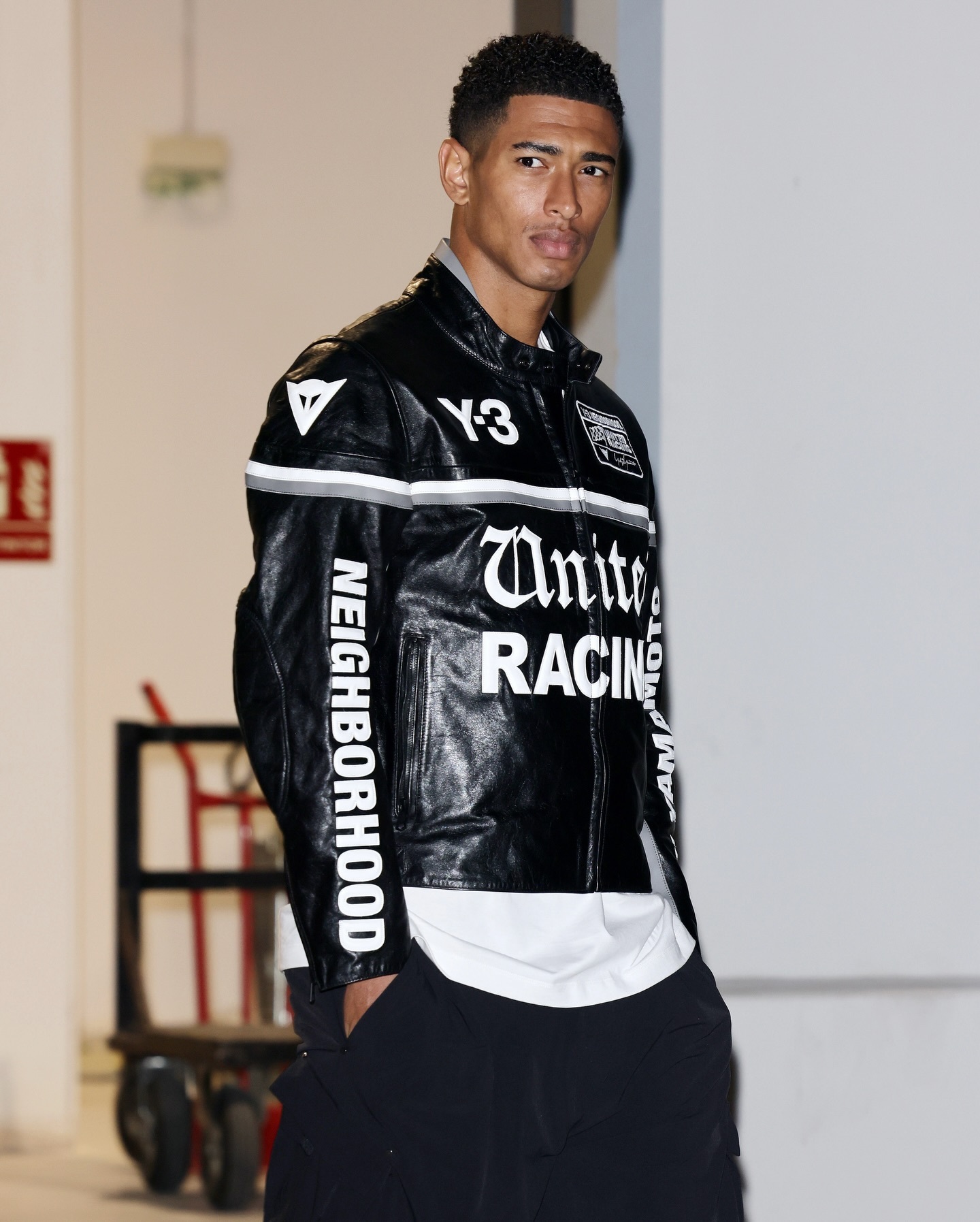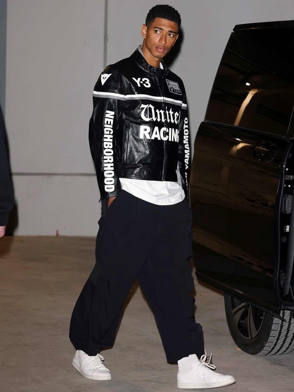 贝林厄姆昨天离开adidas世界杯拍摄活动 身穿Y-3 × NBHD 皮革赛车夹克,以及 Y-3 Stan Smith 运动鞋