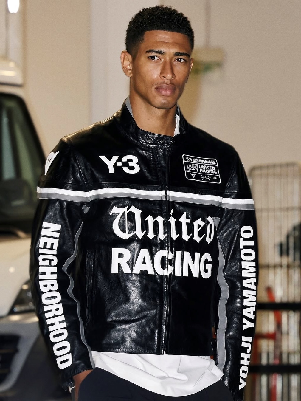 贝林厄姆昨天离开adidas世界杯拍摄活动身穿Y-3×NBHD皮革赛车夹