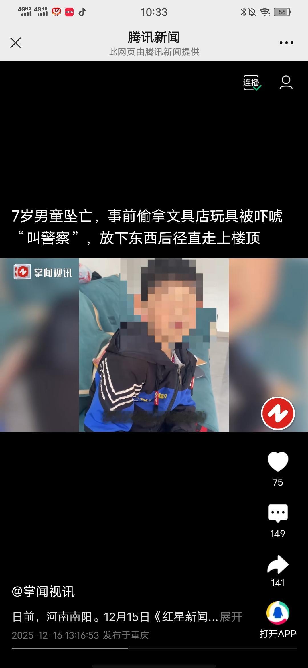 7岁男童坠亡,事前偷拿文具店玩具被吓唬“叫警察”,放下东西后径直走上楼顶。 这是