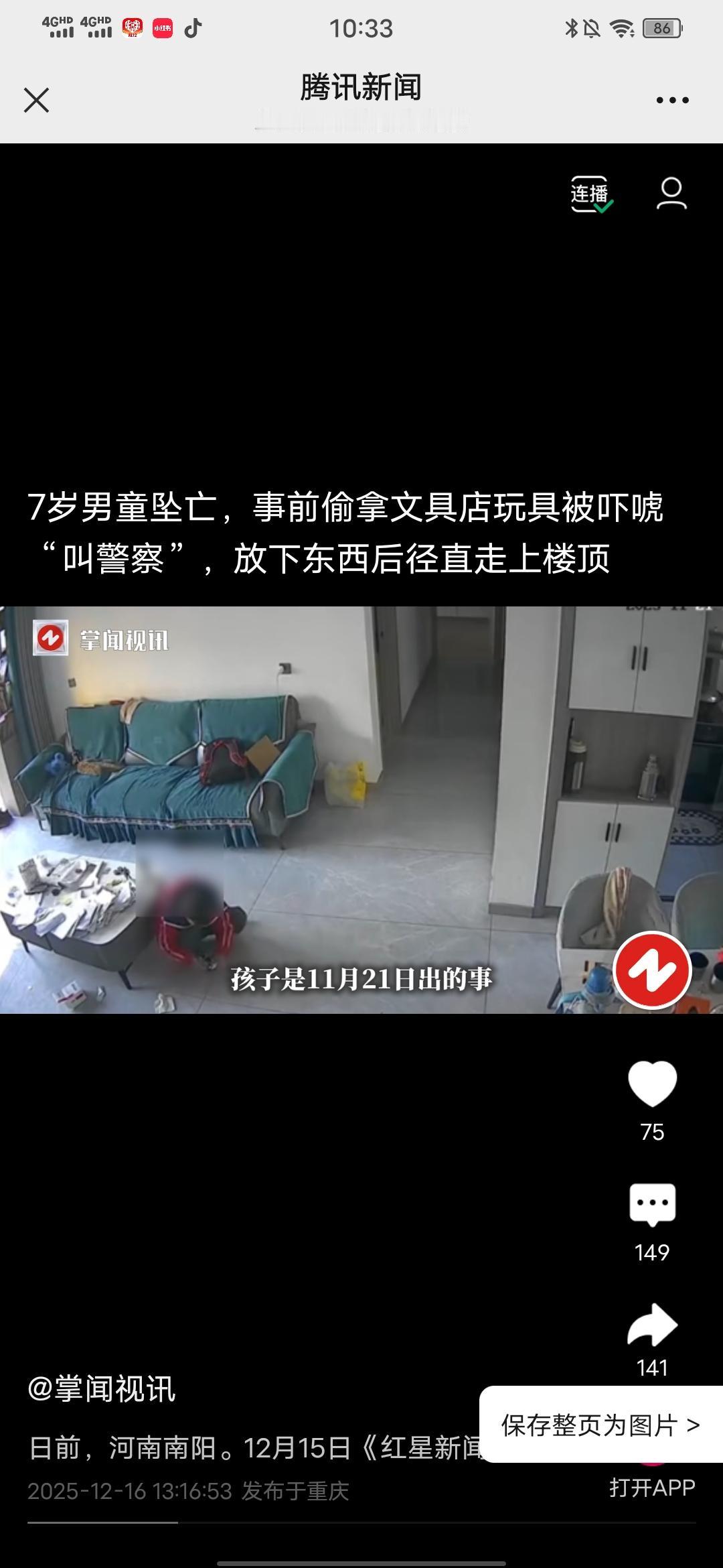 7岁男童坠亡,事前偷拿文具店玩具被吓唬“叫警察”,放下东西后径直走上楼顶。 这是刚在掌闻视讯平台看到的报道,说的是来自《红星新闻》的消息,在河南南阳,镇平县一名7岁男童从一小区高层平台坠楼身亡。事情发生前,也是当天,孩子的父母有事外出了,孩子由爷爷奶奶照看,然后孩子在小区游乐园玩耍,之后到小区外一家文具店里逗留了约9分钟,拿了一个几块钱的奥特曼玩具,藏在衣服里想带走,结果老板发现了,并斥责了他,还吓唬他说“叫警察”,但并没有对他另外再多加其他言语或行为上的伤害,并让他放下东西就离开了,离开后这男孩就上了楼顶。 事后孩子的父亲却将责任推到文具店老板身上,并报警,警方经过调查确定本案没有违法事实,随后终止了调查。 这个报道后面的评论区,我看到的大都是比较理智的人们,这样的现象很好。 像这样大小的孩子相关的事件层出不穷,但是我觉得大都是因为家长照看,看管,教育不力造成的,才7岁的孩子,让他自己一个人出门,家长也是心大,难道家里都没有电视,甚至手机都没有吗?不可能撒,关于小孩子的那些悲剧没有看到过吗?这样小的孩子出门啥风险都有,难道家长一点常识都没有吗?不要因为自己的失职,内心的愧疚找一个替罪羊。 人家开店做生意,不是搞慈善的义工,偷拿了别人的东西,别人有权利让你交出来,出言斥责也是情理之中,家长做到位了,孩子不至于这样,人老板没有违法行为。 关键是,自己的孩子,自己要上心,要照顾好保护好,孩子的心理,孩子的需求,大人都好好了解并理解了吗?孩子喜欢什么玩具你知道吗?知道后你理解了吗重视了吗?孩子需要的陪伴,心理建设你都努力做到了吗?责任在家长自己,不好好反省自己的问题,就算勉强找了替罪羊,你内心也难安,也难得到真正的释怀。