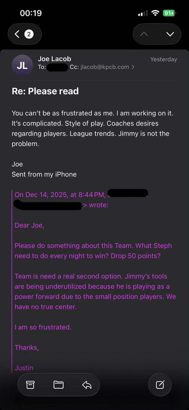 有点意思啊兄弟们,可以看看原文⬇️在输给开拓者后,一名叫Justin Dutari的球迷给他猜测的拉科布邮箱发送了邮件,并在主题栏写着“请务必阅读”,内容为:“亲爱的Joe,为这支球队做点什么吧。库里每天到底还要做到什么才能赢球?砍下50分吗?这支球队迫切需要一个真正的第二得分点。巴特勒的能力被严重浪费了,由于阵容太矮,他被迫去打大前锋我们也没有一个真正的中锋。我真的太沮丧了。”没想到拉科布还回了邮件:“你不可能比我更沮丧,”拉科布写道。“我正在处理,这很复杂。比赛风格、教练对球员的期望、联盟趋势。吉米不是问题所在。”金州勇士新赛季篮不住