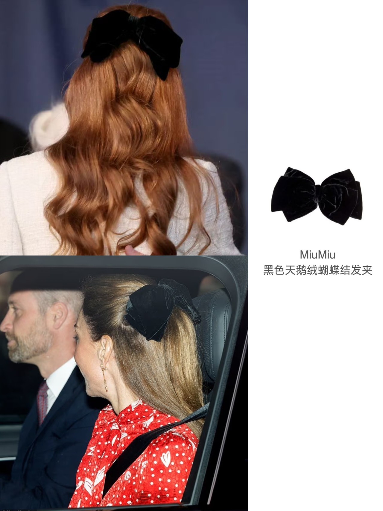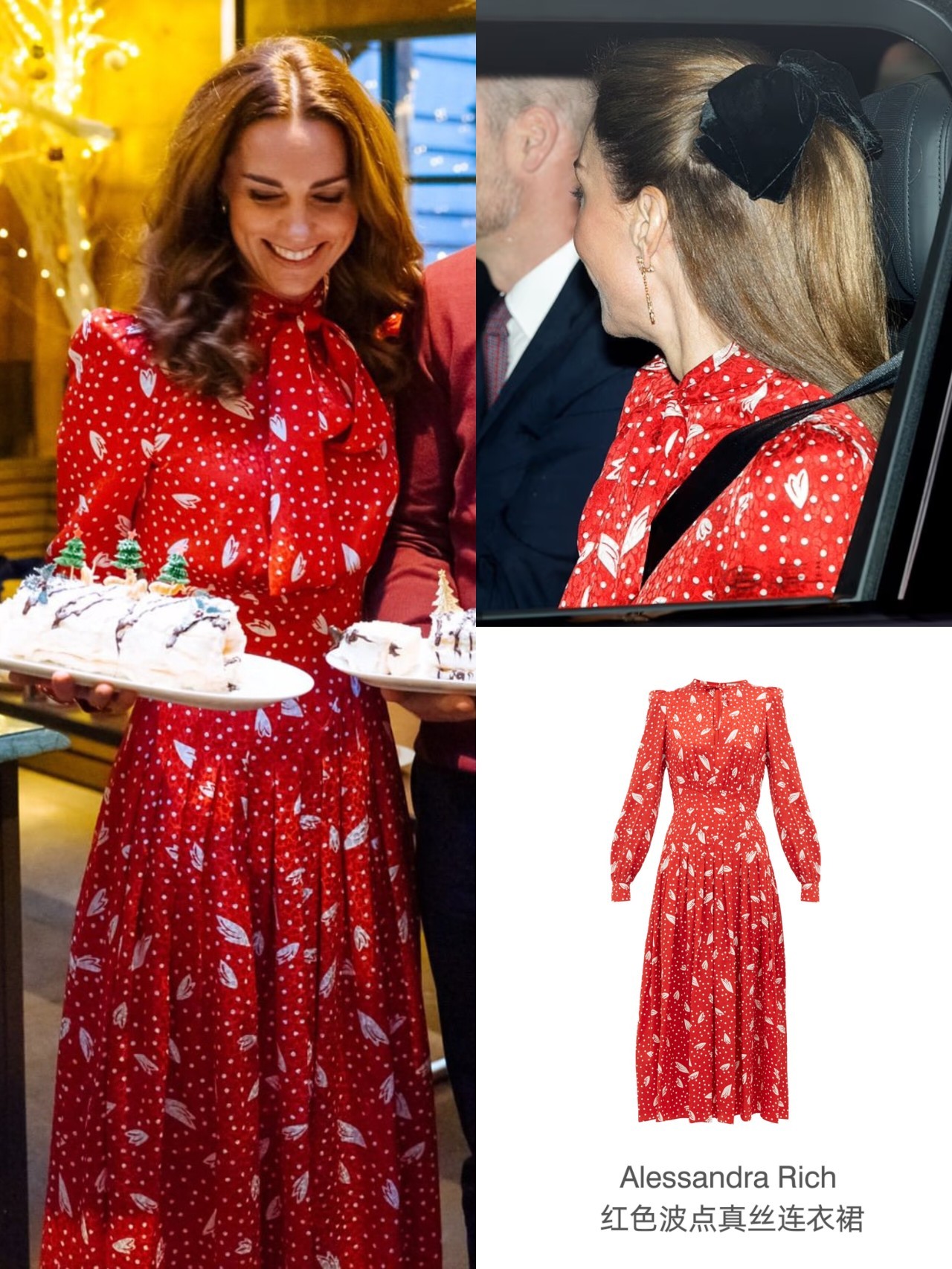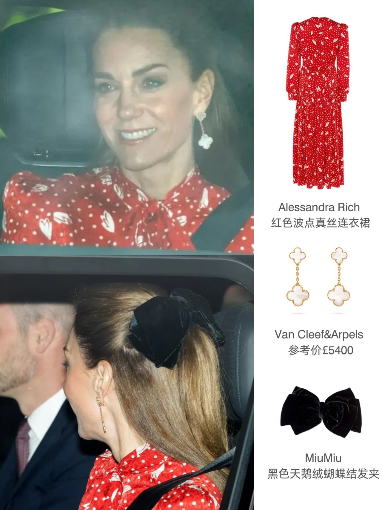 圣诞午宴LOOK:凯特重穿了2019年和著名烘焙大师玛丽·贝瑞录制圣诞主题节目时所穿的Alessandra Rich波点连衣裙,搭配以她的梵克雅宝耳环,虽未见全身LOOK,但盲猜鞋履应该是Gianvito Rossi红色麂皮高跟鞋,蝴蝶结发夹则来自MiuMiu(母女俩依旧是半披发的同款发型)~英国王室凯特王妃王室时尚