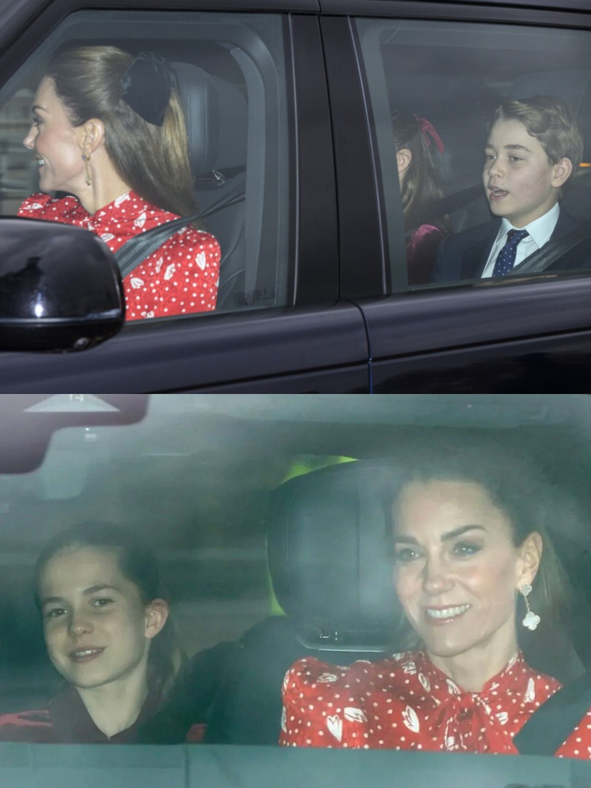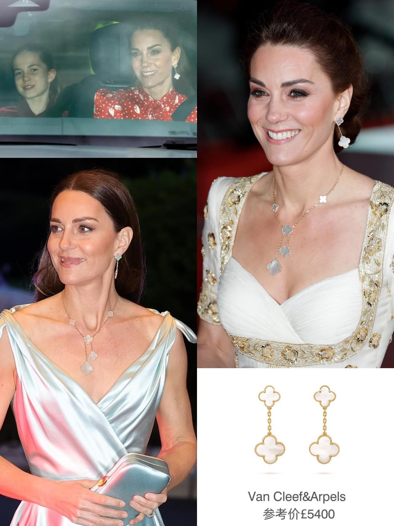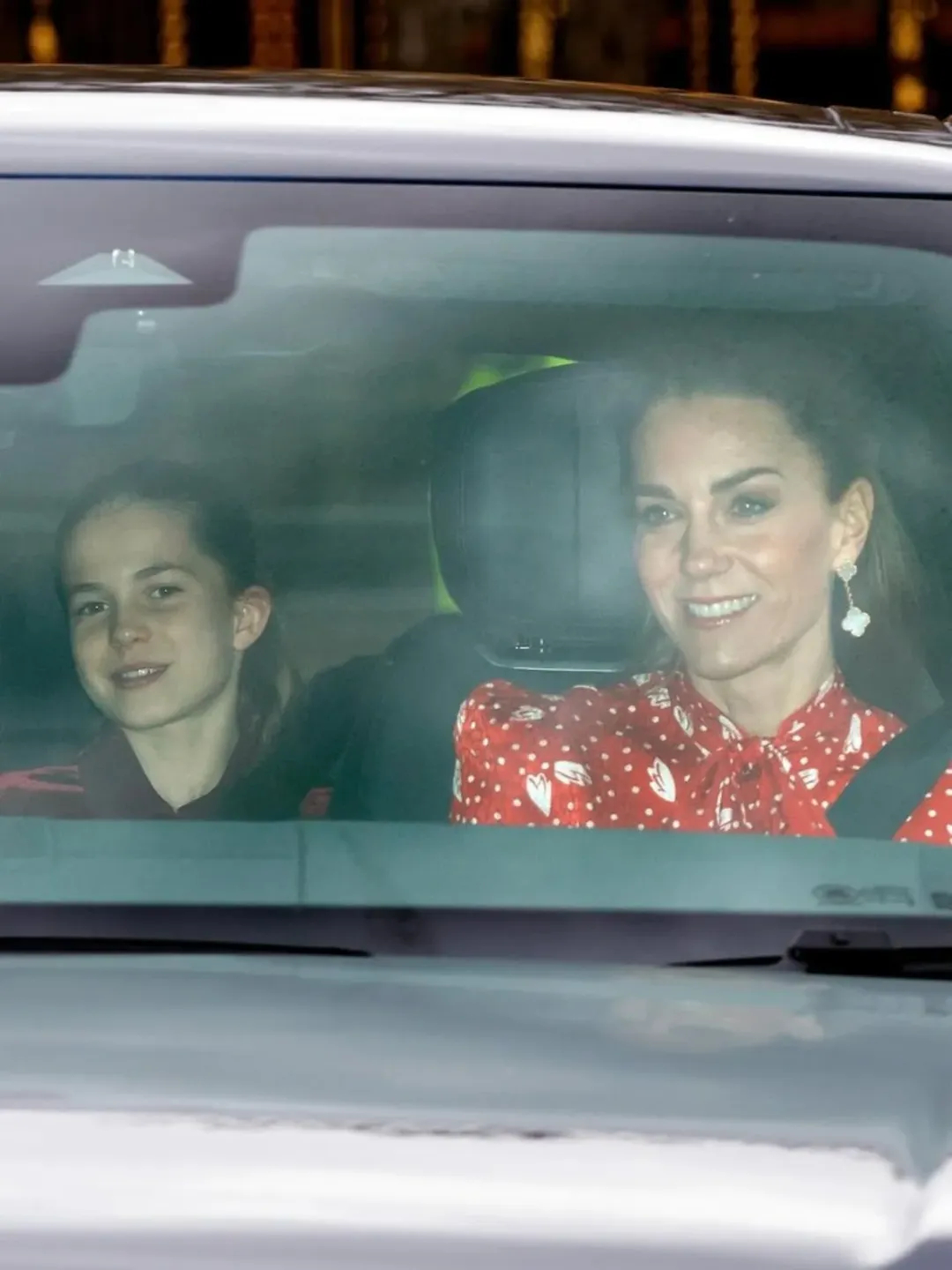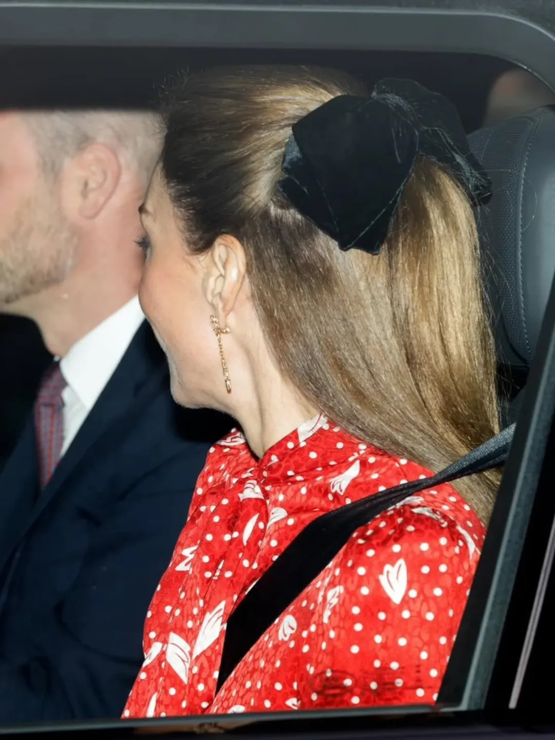 圣诞午宴LOOK:凯特重穿了2019年和著名烘焙大师玛丽·贝瑞录制圣诞主题节目时所穿的Alessandra Rich波点连衣裙,搭配以她的梵克雅宝耳环,虽未见全身LOOK,但盲猜鞋履应该是Gianvito Rossi红色麂皮高跟鞋,蝴蝶结发夹则来自MiuMiu(母女俩依旧是半披发的同款发型)~英国王室凯特王妃王室时尚