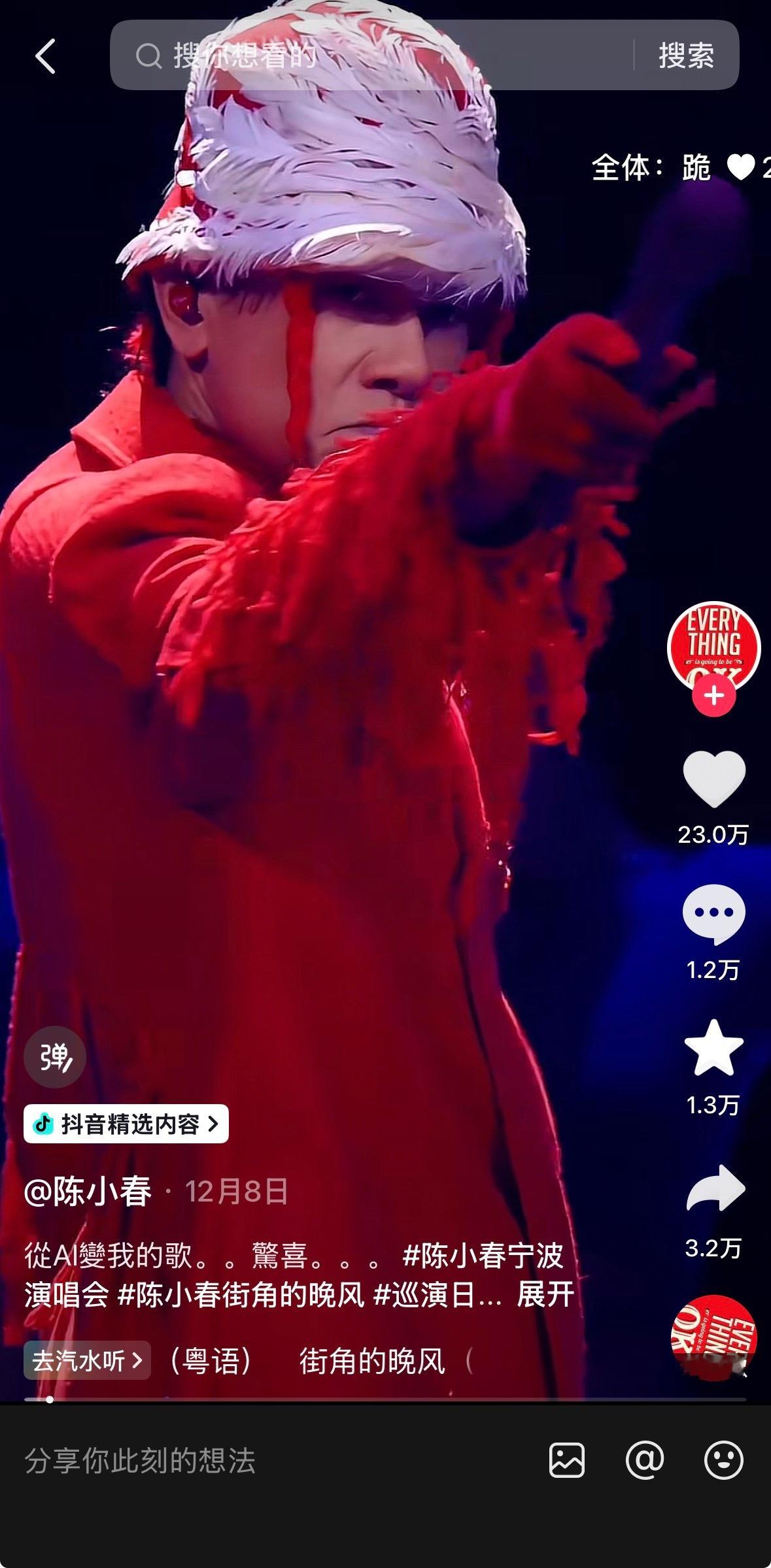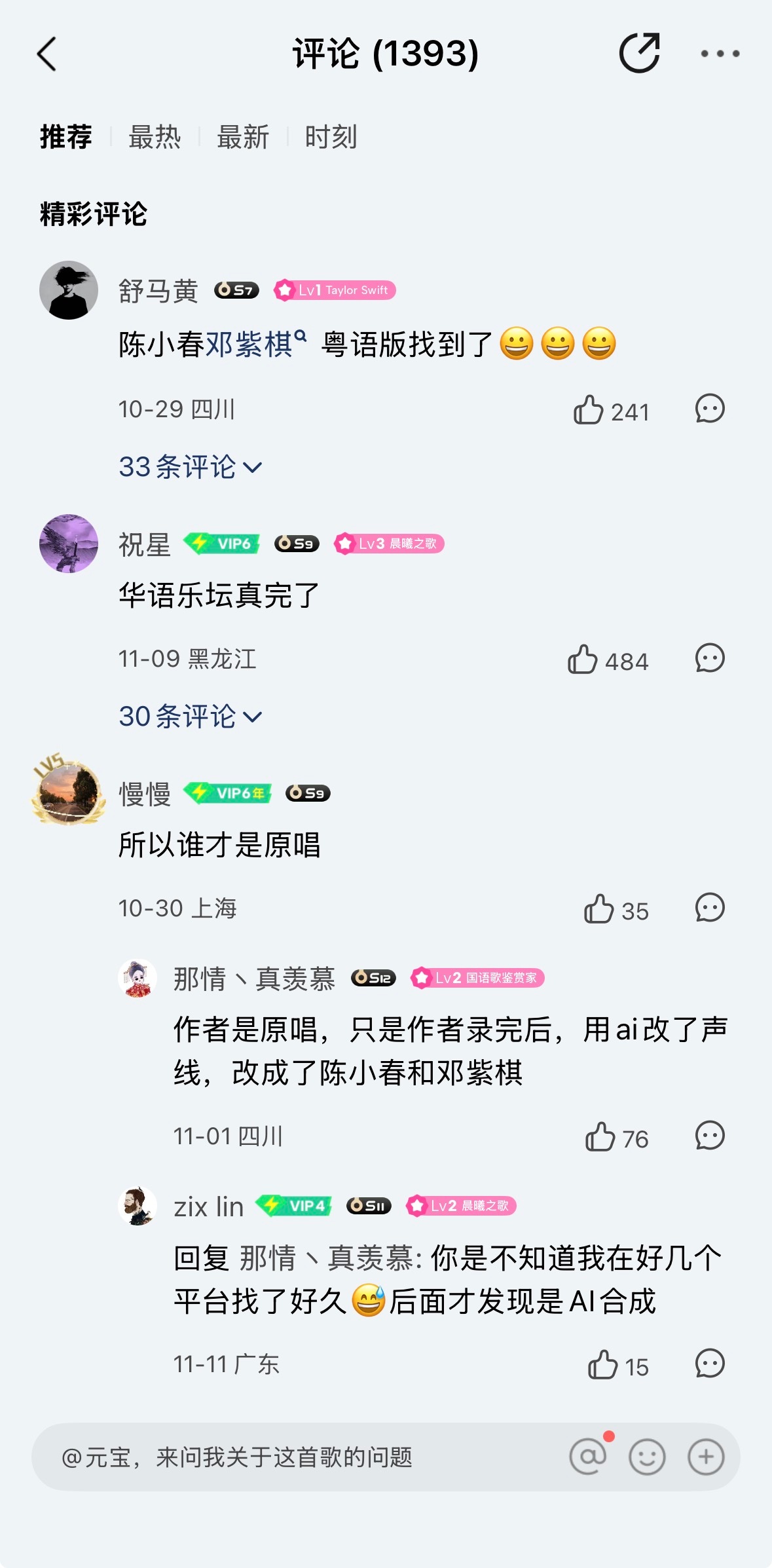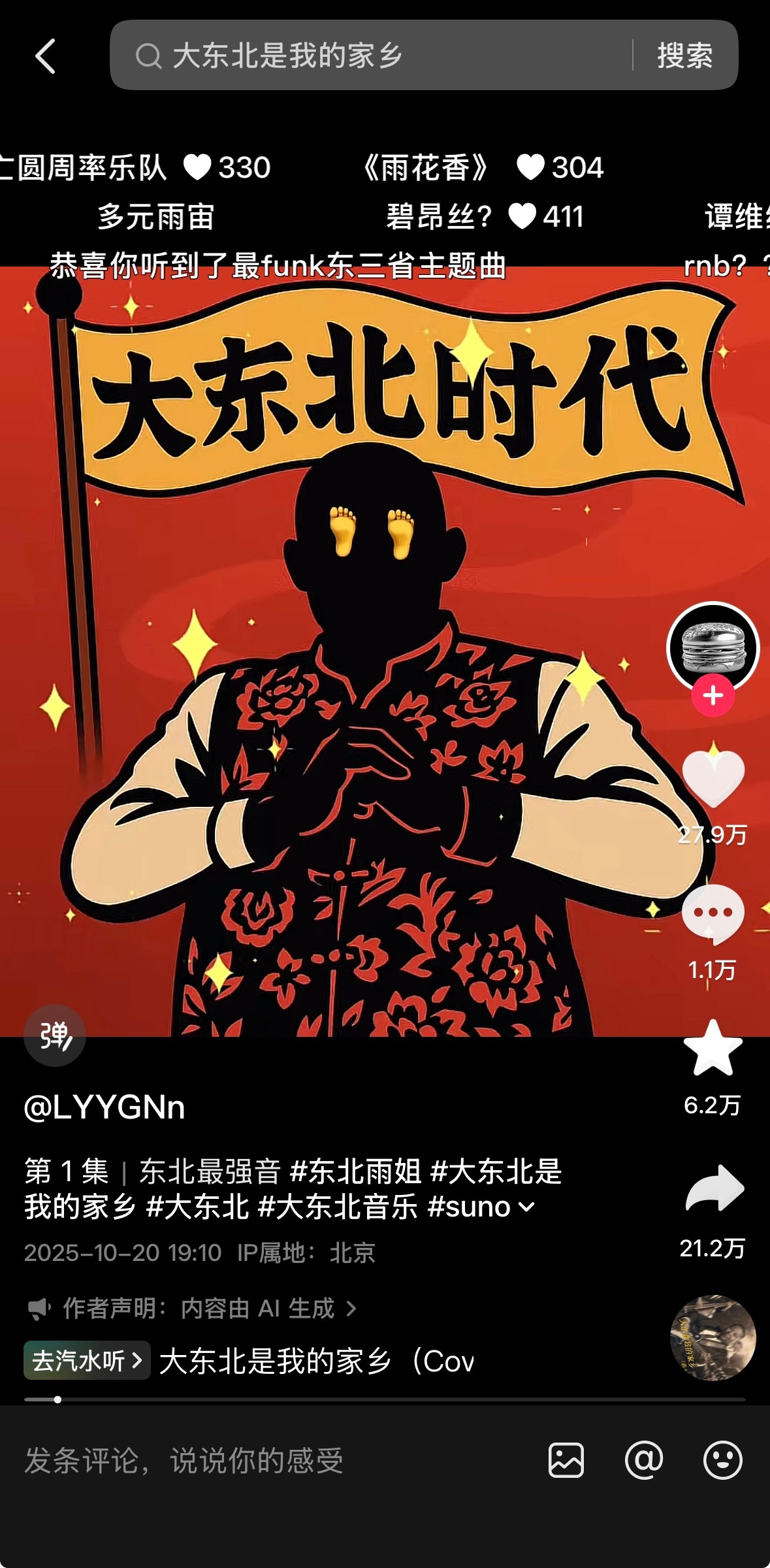 了解了一下最近 AI 音乐的几个标志性事件,都很有意思,你会发现在 2025 年年底这段时间,大家居然跟 AI 玩的这么好。1.《大东北我的家乡》,起初是 AI 生成的爵士版走红(原作者见图 1,他粉丝居然才不到 1 万),这首歌在短视频平台配乐中非常火。因为里面的 AI 人声很像袁娅维,在被 Q 之后,袁娅维主动改编并演唱,网友戏称其莫名其妙就捡了一首代表作。2.《街角的晚风》,起初是几个 up 主录了歌之后,再把声线改成陈小春、邓紫棋,歌曲在网络爆火,陈小春知道之后,买了歌的版权,并在演唱会上演唱。3.《技能五子棋》,这个大家熟一点,张兴朝的抽象表演配合这首 Suno 生成的歌,直接引爆全网,引来很多明星大咖都去蹭这首歌的热度。这几个爆火,我觉得都很难预测,基本上都属于预料之外,但它就那么真实发生了,也切实在改变一些事情。
