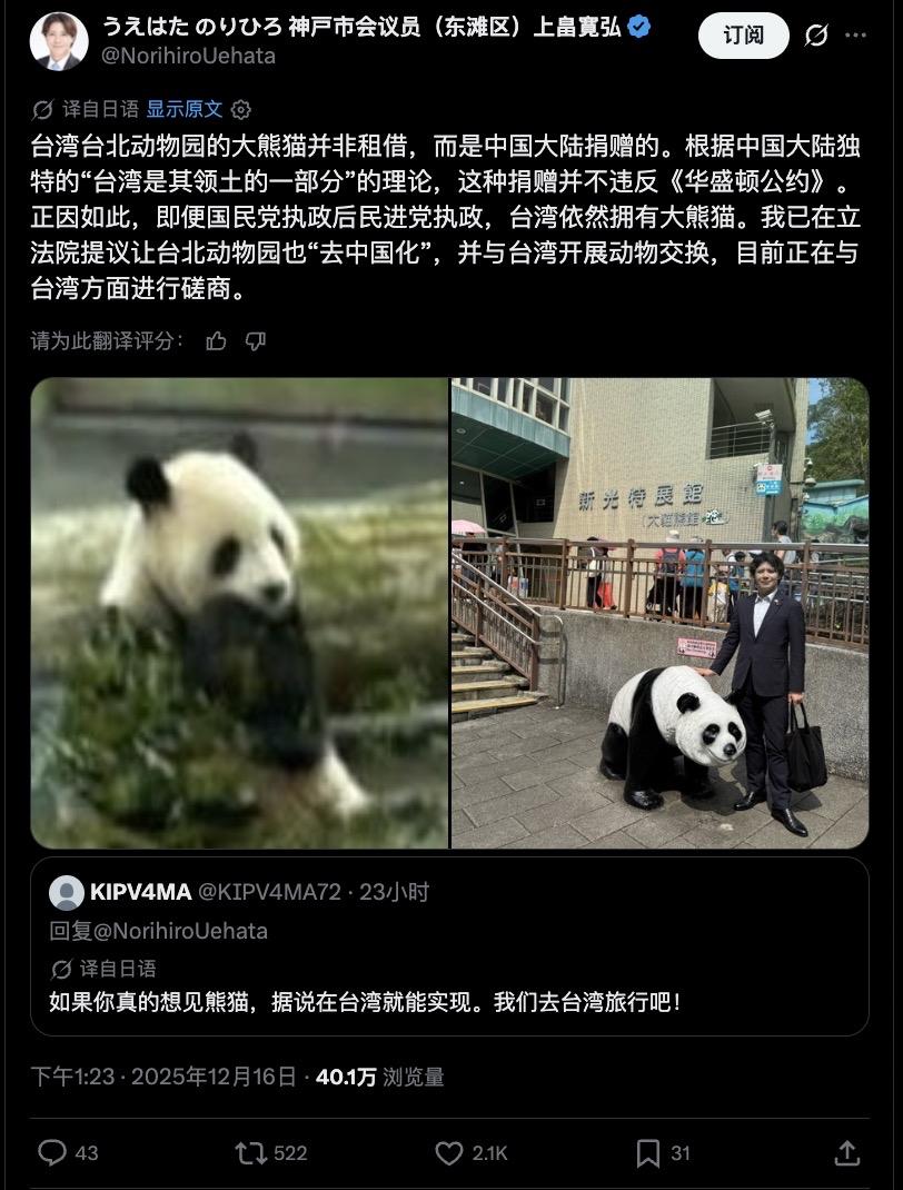 日本民众:“我不想要’破坏和平’的高市,但我想要熊猫”。 日本两只大熊猫即将在下个月返回中国,一些喜爱大熊猫的日本民众在X上表达惋惜之意!他们认为,因为首相的挑衅言论,让他们的快乐也消失了。一些人甚至发出:“我不想要“破坏和平”的高市,但我想要熊猫,它被称为“和平的象征”。”但也有一些极端言论,一位日本网友认为,这是中国故意利用大熊猫来分裂日本的阴谋! 更令人气愤的是,甚至有日本议员正在与我台湾省进行磋商,把大陆捐赠给台北的两只大熊猫交换至日本。他甚至已在台湾省立法机构提议让台北动物园也“去中国化”。 中国擅长搞熊猫外交,原本是中方表达对两国友谊的象征,但日本首相涉及台湾问题的挑衅言论,极大地伤害了两国关系。日本不重视中方严重关切,也深深伤害了中国人。在这种形势下,在东京的两只大熊猫即将按期回国,实属正常。同时也没必要再次向日本赠送大熊猫。 不过有日本议员呼吁交换台北的大熊猫至日本,并正在采取措施。这是对我方的新挑衅。台北若将大熊猫交换至日本,大陆就收回对台北的捐赠,并对其实施惩罚,绝不允许台北与日本进行“勾连”。 上野大熊猫 旅日熊猫