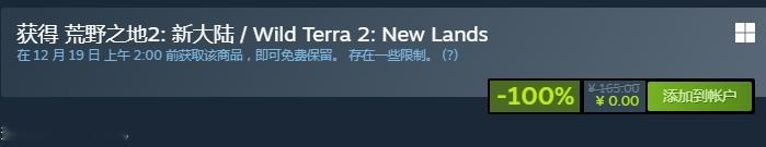 【Steam喜+1,原价165元的《荒野之地2》免费送】中世纪MMORPG游戏《荒野之地2 新大陆》(Wild Terra 2:New land)现已在Steam平台免费领取,在12月19日上午2:00 前获取该商品,即可免费保留。《荒野之地2 新大陆》可以让您在中世纪世界中扮演建筑商、铁匠、渔夫、治疗师、炼金术士等属于您的角色,加入公会或单人游戏。猎杀巨大的首领,探索黑暗的地牢这都取决于你。
