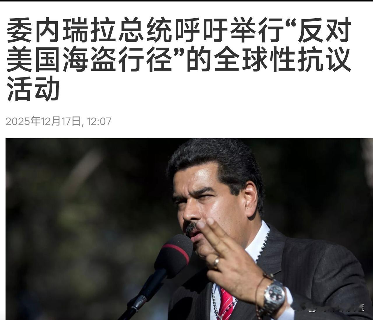 特朗普认定委内瑞拉政府为“恐怖组织”,委内瑞拉称美国为“海盗国家”!“战”乱! 12月17日 美国总统特朗普称,他认定委内瑞拉现任政府是外国恐怖组织。 他还警告称封堵所有进出委内瑞拉并受到制裁的油轮。 特朗普在“真实社交”平台发文称:“由于窃取我们的资产,以及包括恐怖主义、毒品走私和人口贩卖在内的诸多其他原因,委内瑞拉政权已被认定为外国恐怖组织。”同时表示:委内瑞拉必须归还美国的所有石油 土地 及资产! 面对美国政府的逼势,12月17日 委内瑞拉总统尼古拉斯·马杜罗呼吁,定期组织有石油、天然气和海事行业工人参与的“反对美国政府海盗行径”的全球性抗议活动。委内瑞拉总统将美国 冠名为“海盗国家”,拦载了委的油轮。 如今美国发行新版的《国家安全战略》其中重点表述:美国将全球核心利益转移到西半球,而美洲就是美国利益的重点,而美国企图将美州独霸为美国的洲,其中对委内瑞拉的军事围者就是美国独霸美州的开端! 委内瑞拉的石油资源 黄金矿产 及天然气是美国想要的,而且进一步将是要独呑美洲,同时将中国与俄罗斯在美洲的利益挤出西半球,这就是美国的战略意图!