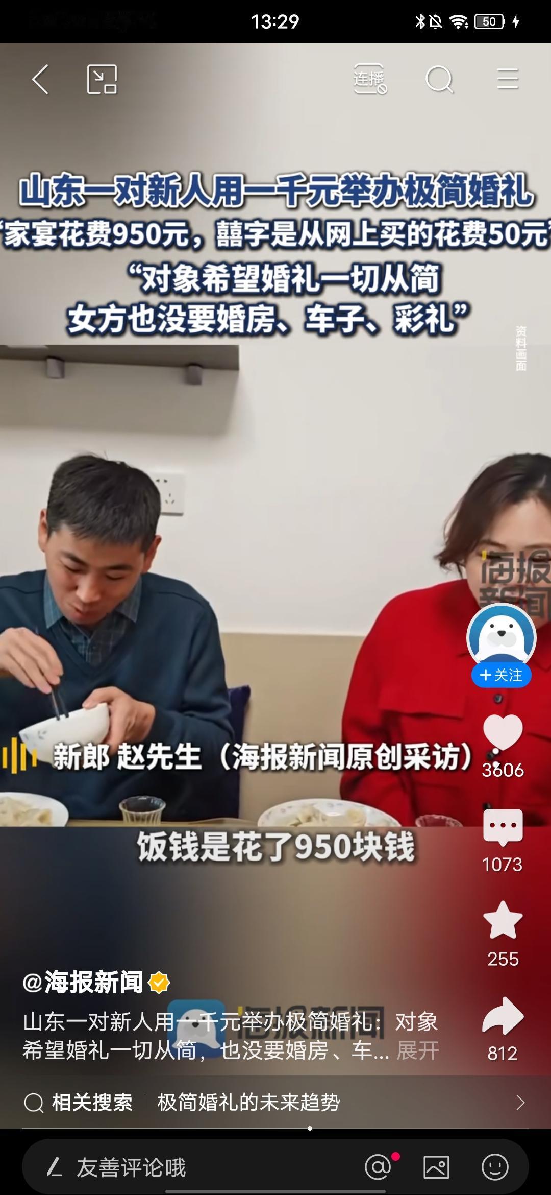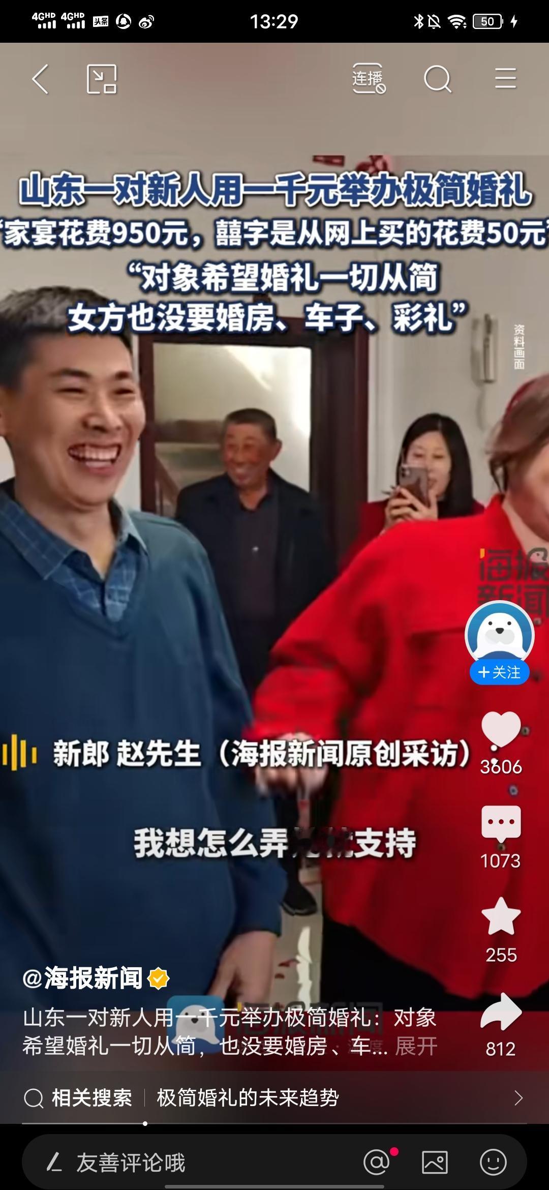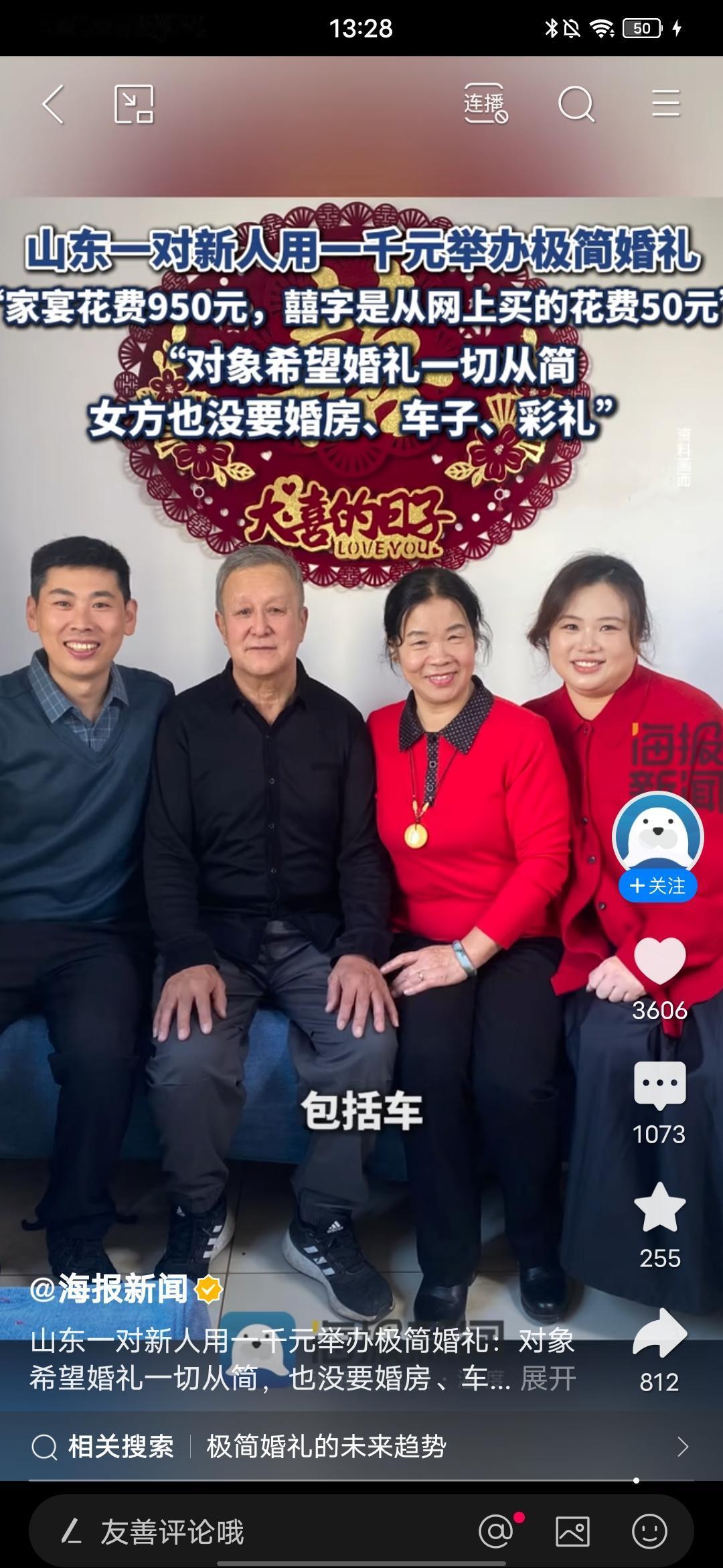 山东一对新人用一千元举办极简婚礼:对象希望婚礼一切从简,也没要婚房、车子、彩礼。 刚看到海报新闻的报道,说的是山东东营的一对新人,结婚没要婚房,车子,彩礼等,婚礼都只花了950元,喜字等都是花50元从网上购买的,大概这是我听过最省钱最简约的婚礼。 很多网友都觉得值得提倡,确实,这婚是和相爱的人结,又不是结给别人看的,日子也是自己过的,别人也无法代劳,自己小两口过得舒心自在才是最好的。 其实,我觉得这就跟最近这两年情人节商家生意不比之前火爆一样的道理,大家的认知都更实际了,换了更实在更温馨的仪式感,也是目光长远的表现。办一场宴会下来,劳民伤财,实在没有太大必要,因为日子终究还是自己过,不会因为一场宴席就能决定幸福与否。 用办宴席的钱来一场说走就走的旅行,少了很多宴席的繁琐,多了更多精神层面的夯实,反而更有利于两人的感情,留下更多美好的回忆。 没房没车也没有关系,只要小两口齐心协力,携手同行,努力奋斗,一切都会有的,祝愿这对新人新婚快乐,百年好合!
