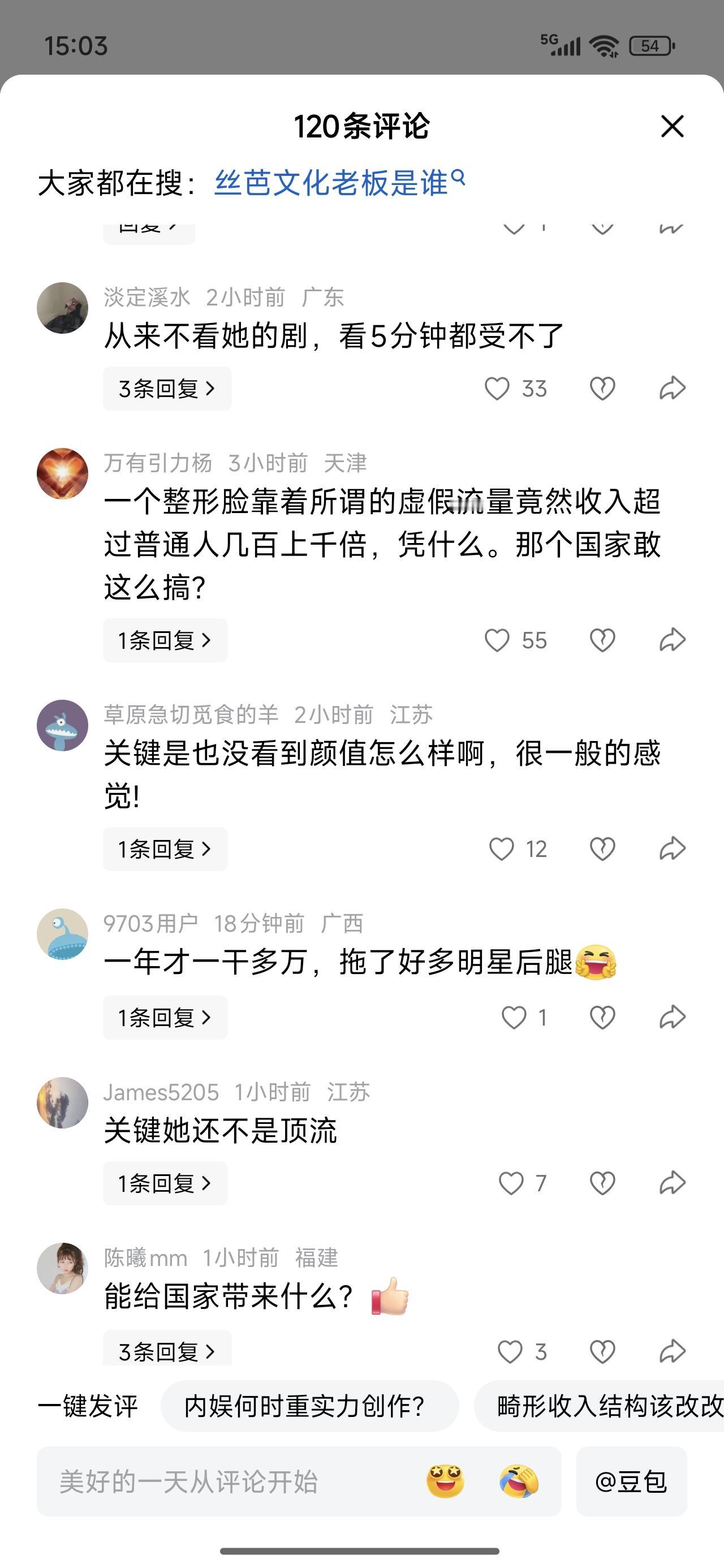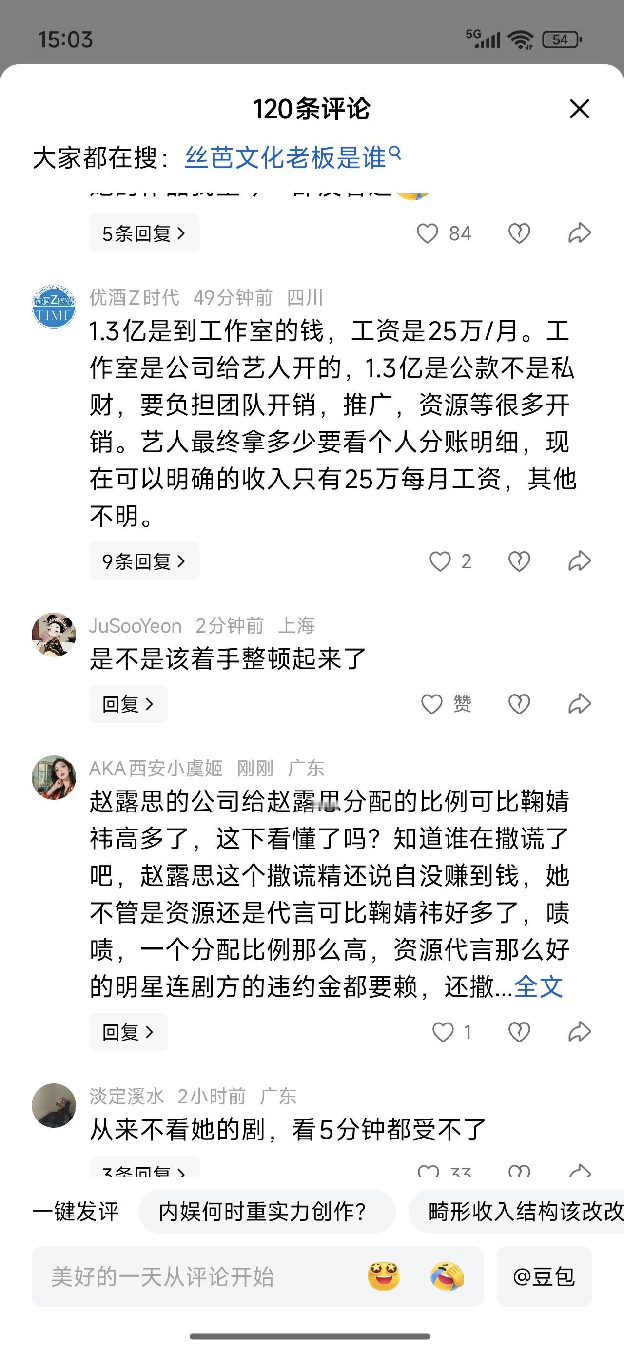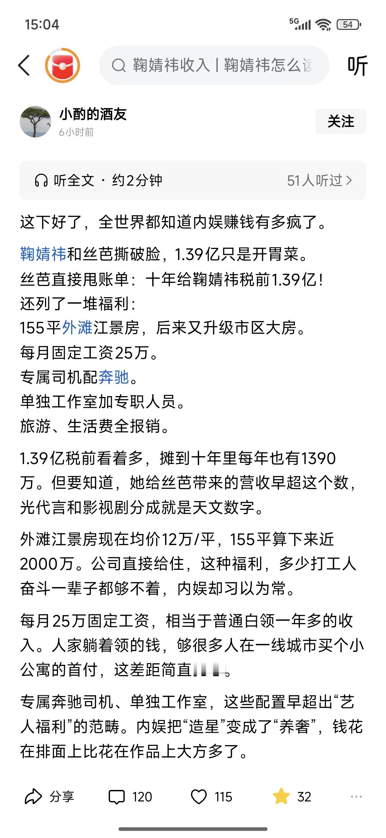 鞠婧祎和丝芭撕破脸,1.39亿只是开胃菜。 丝芭直接甩账单:十年给鞠婧祎税前1.39亿! 还有福利: 155平外滩江景房,后来又升级市区大房。 每月固定工资25万。 专属司机配奔驰。 单独工作室加专职人员。 旅游、生活费全报销。 内娱是真赚钱啊!一个4000年才出的一个美女。 一个官方身高159都有争议的女生,拥有这么大的能量,吸引这么多的财富可支配。内娱真是个巨大的印钞机啊! 怪不得演三代,唱二代,相声二代小品二人转二代都要挤进来,原来钱真的太好赚了。热泪盈眶的感动着。都想演给我看,我谁啊我!鞠婧祎