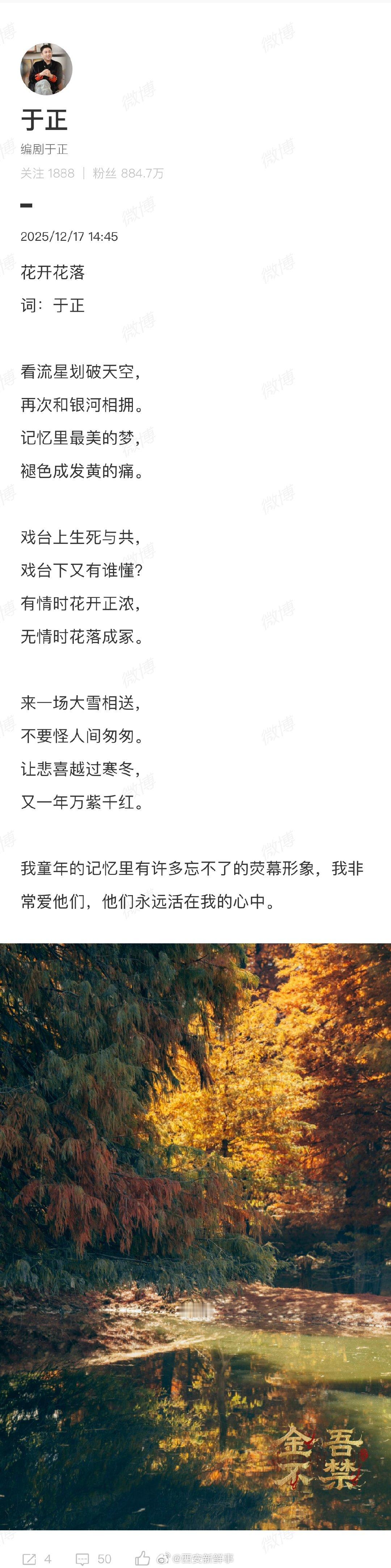 【于正悼念童年荧幕形象】于正写词悼念童年荧幕形象12月17日,导演在社交平台分享自己写的一首词,并表示:我童年的记忆里有许多忘不了的荧幕形象,我非常爱他们,他们永远活在我的心中。随后,有网友问其这首词是否为新剧《金吾不禁》所写,于正表示,不是,是悼念自己童年喜欢的荧幕形象。