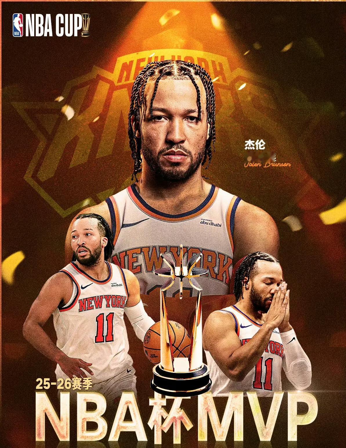 恭喜布伦森获得NBA杯MVP! 今日纽约尼克斯在NBA杯决赛以124-113逆转险胜圣安东尼奥马刺,布伦森本场贡献25+4+8+2盖帽的数据,并以19票支持率碾压性斩获了MVP。 淘汰赛阶段布伦森以55%的命中率场均可以拿下33.3分6.7助攻,可以说布伦森实至名归,布伦森在拿到NBA历史上第三个杯赛MVP的同时也终结纽约52年来的冠军荒!