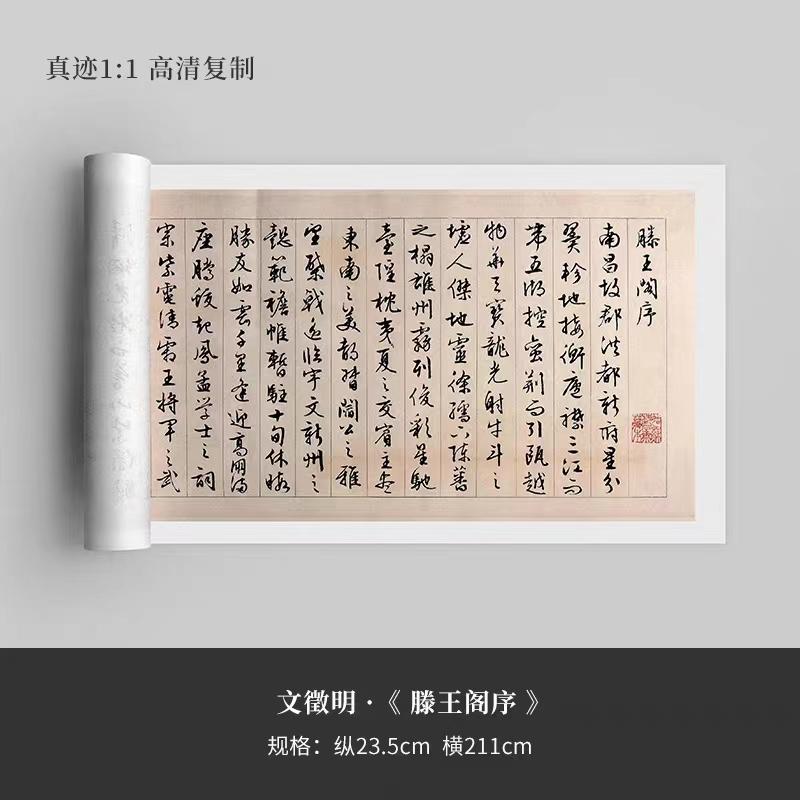 文徵明80多岁写的《滕王阁序》,已达“人书俱老”境界,每一笔功力非凡! “江南四大才子”以文徵明最为长寿,他一生活了接近90岁,直到临终前还在写书法,据史籍记载:“年九十而聪明强健如少壮人,方与人书墓志,甫半篇,投笔而逝。”文徵明传世书法较多,越到晚年水平越高,特别是70岁以后的字,已达“人书俱老”境界。 文徵明一生写的最多的是《滕王阁序》,可惜绝大部分已经失传,现藏于北京故宫的版本是其唯一存世之作,写于80多岁,已达“人书俱老”境界,每一笔都凝聚了70多年的功力,笔力非凡,清人梁诗正称此作:“文辞华美而书亦雅隽,乃才子笔墨之圭臬。” 此作以行书写就,为纸本手卷,纵约23.5厘米、横约211厘米,共76行、800余字,单字大小约2厘米,内容包括王勃《滕王阁序》和《滕王阁诗》。文嘉记载,文徵明生平最爱抄写《前后赤壁赋》和《滕王阁序》,特别是后者,曾一个月间写了500多遍。 文徵明的行书主要取法于赵孟頫、米芾、李邕、王羲之诸家,而以书卷气破除姿媚孱弱。此作顺锋入纸,行笔速度均匀,收笔时锋颖自然回收,形成“玉箸”般的圆融笔画。这种笔法源自他对智永《真草千字文》的深度研习,但去除了唐人写经的装饰性,更添文人书写的自然。 通过腕部微妙的提按完成方向转换,转折处外轮廓保持圆润饱满,内部却蕴含筋骨。结字平正中求动势,通过部件间的微妙错位制造生机,如“鹤”字左旁升高,“凫”字下部右移,看似不经意的调整,使得全卷有了动势和韵律感。 文徵明对长卷节奏的把握非常精到,全文八百余字,他通过字组关系形成视觉段落,使观者在阅读过程中自然感受到情感起伏。墨色以润为主,在收笔、出锋时自然出现枯笔、飞白,没有过于刻意的对比,不以狂怪示人。 文徵明这部《滕王阁序》可以说是雅俗之间的典范,清代梁巘在《评书帖》中评价:“徽明书如八旬翁,步履安详而筋骨内蕴。”此作没有少年人的炫技,没有失意者的狂狷,只有历经数十载临池后的平静与自信。 这卷《滕王阁序》即使与宋元真迹并列,我们也能感受到笔法的精到和正宗,同时不同于唐人的工致、米芾的跳宕、黄庭坚的奇崛转,而是有文人雅士的隽永,在传统的框架内,将每一个细节都推向完美的极致。将此作临摹通透,不仅可以学到晋唐宋元行书笔法精髓,还能克服书中的俗气。 而今,我们将此作进行了博物馆级的超高清1:1复制,见此作如见原作,便于您临摹和欣赏。 文徵明《滕王阁序》高清复制宣纸艺术微喷行草书法字帖临摹