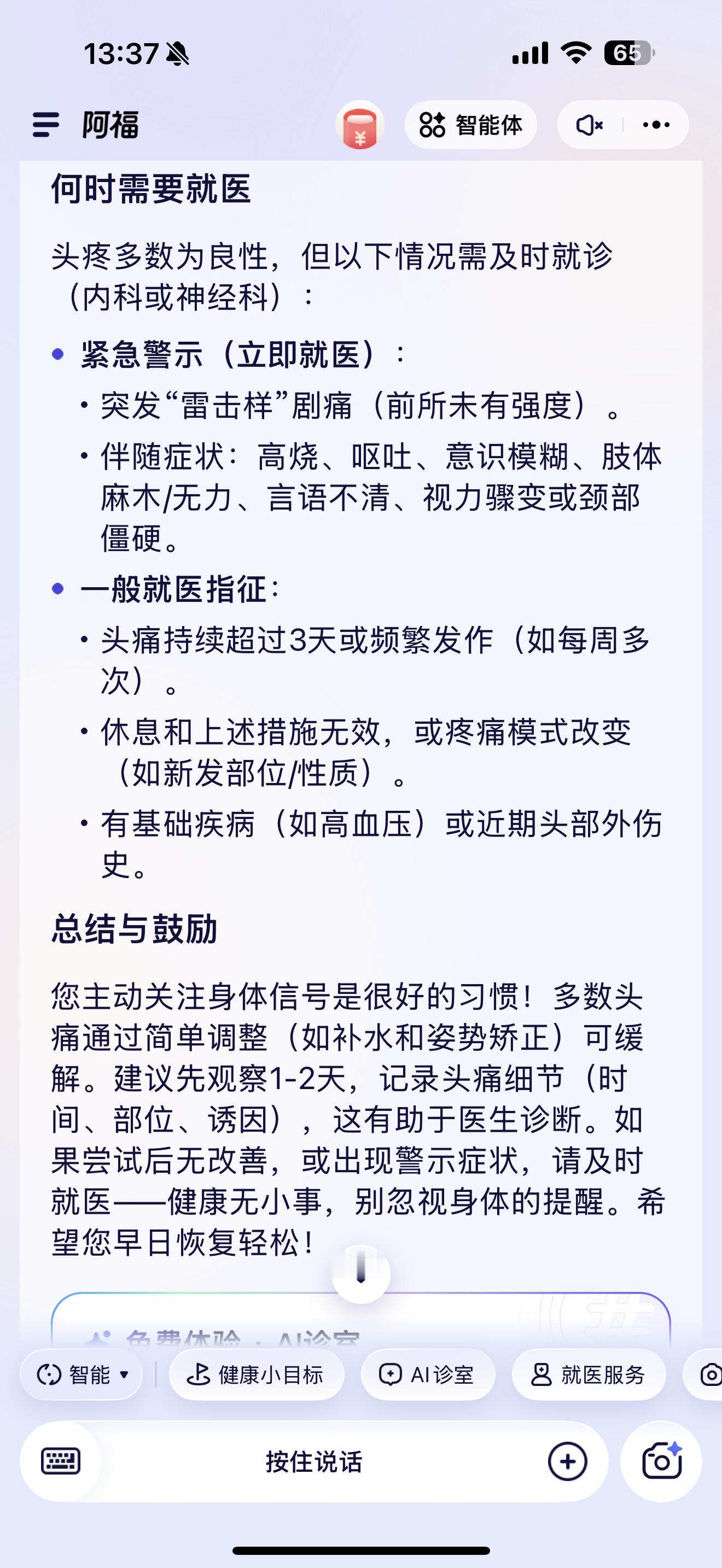 昨天落地北京,回家第一件事就是开车带宠物去医院打针,这件事已经持续了一个月了,在这期间医生说做什么检查,我们能做的就是花钱配合,恰好这次刚从蚂蚁阿福的发布会回来,对健康有了一些新的感悟。这两年其实能明显感觉出来自己的身体状态越来越差,熬不动夜,喝不动酒了。可能在别人眼里,我可能马上也要到了老登的年纪了。所以,健康这个问题更是不得不提了。刚才突然有一个词蹦出来,叫不知者无畏,这还挺符合我们对身体健康的认知的。坏肚子,吃错东西了,头疼,没睡好,缺觉了,难受,忍一忍就过去了,根据经验去判断自己的身体出没出问题,反正只要我不去医院检查,我就没有病,所以我说无知者无畏。我们不是学医的,那我们很多人对健康的定义就很模糊,这个才是我认为最可怕的,蚂蚁阿福这次升级,有朋友说他是断层式领先,不仅可以关联同步很多设备的数据,还有医生分生去问诊,帮你去说清自己的感受,吧啦吧啦还挺多的。在我看来,阿福能带给我的是让我不再无畏,阿福阿福,我昨天休息的很好,可我还是有些头疼,这个时候阿福可以给到我一些专业角度上的意见让我们可以正确的看待头疼,这个才是真正蚂蚁阿福这类产品给我们最大的福利。也许以后,在硬件的配合下,可以做到更好的陪伴和监护,可以把各大医院的数据及时同步,可以关联在线监看亲人的健康情况,这些都有可能,但目前我们更需要的是重视自己的身体,有问题就问。只有自己重视自己的身体,才能更好的预防一些重大的疾病风险,身体出了问题就及时地解决。刚去家门口的家健身私教馆约了明天的体验课,健康第一步,重视自己的身体,健康第二步,让自己动起来。科技先锋官蚂蚁阿福