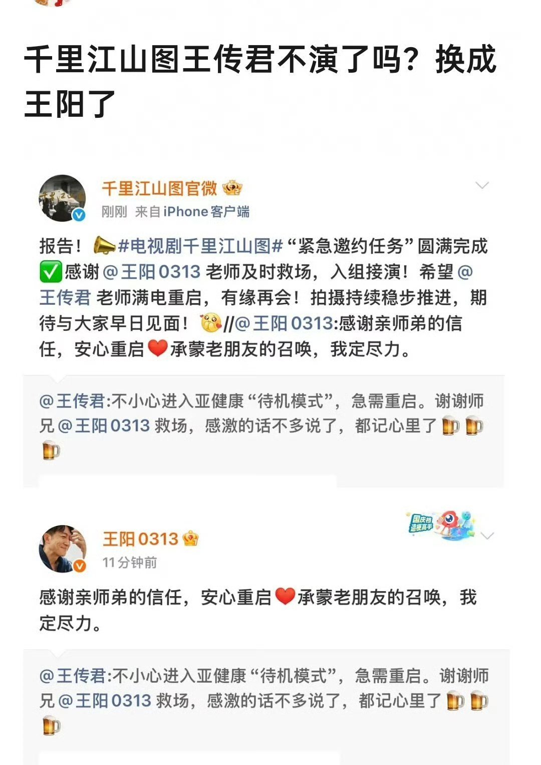 王阳救场王传君千里江山图王传君因生病了退出《千里江山图》王阳救场,事情交待得清楚明白,不引发猜疑和矛盾。小声说话:王阳更帅演技也好啊啊啊