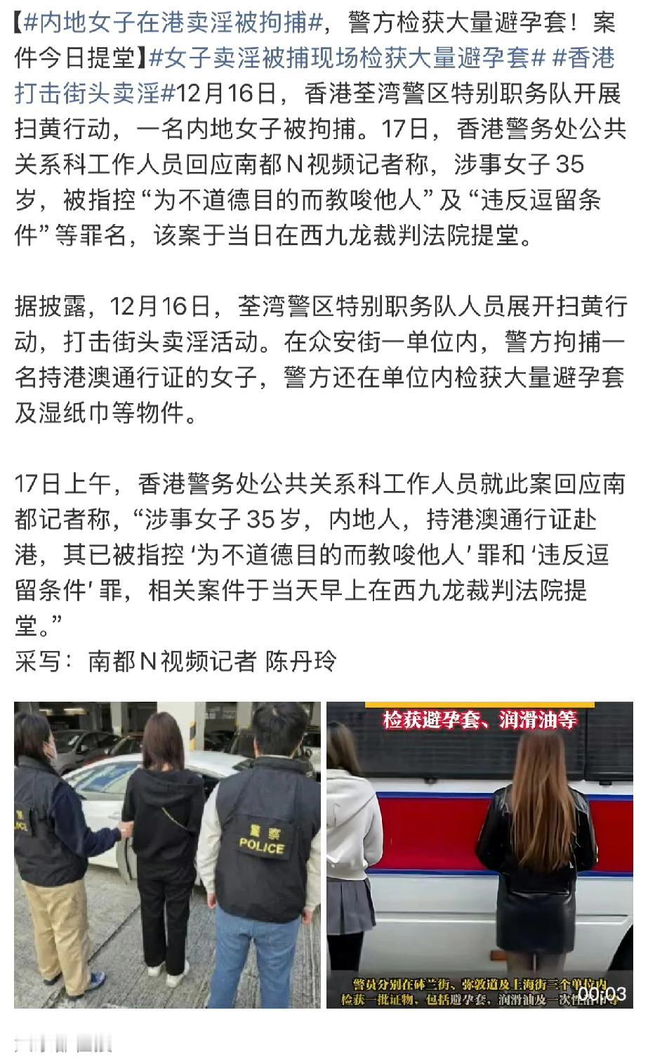 内地女子在港卖淫被拘捕!!! 香港警方近日在荃湾和油麻地的扫黄行动中拘捕多名涉事女性,其中一名35岁内地女子因现场检获大量避孕套等物品被控“教唆不道德目的”及“违反逗留条件”罪名,案件引发公众对跨境违法、执法标准及香港特殊法律环境的讨论。扫黄大事件 扫黄执法 扫黄现场 广东扫黄 越南扫黄 扫黄广告 卖淫女 新型卖淫手段 新型卖淫 卖淫女子 酒店卖淫 卖淫新暗号 卖淫女纠纷 来源:微博智搜