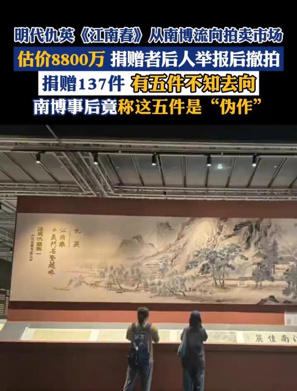 庞家后人1959年把祖传的137件宝贝,包括明代仇英的《江南春》,一股脑捐给了南京博物院,指望着国宝能有个好归宿。谁能想到,半个多世纪后,这幅画居然神不知鬼不觉地溜达到了拍卖行,标价8800万!要不是庞家后人自己刷拍卖信息刷到,这“文物变魔术”的戏码怕是要演成了。 更绝的是,当后人找上门要说法,南博轻飘飘一句:哦,那几件啊,我们查过是“伪作”,早就处理了。好家伙,捐的时候是“虚斋旧藏”镇馆之宝,几十年后说变伪作就变伪作?处理得比丢垃圾还利索,连个影儿都找不着,更别提按规矩公示报批了。这“伪作”身价倒是实打实暴涨到近亿,真是讽刺他妈给讽刺开门——讽刺到家了! 庞家后人一纸诉状告到法院,折腾半天才被允许进库房点验。结果一查,嚯!五件宝贝集体“神秘消失”。南博这“藏品管理”水平,堪比魔术师大变活物。如今法院强制执行令都下了,就看南博能不能变出个“合理去向”的戏法了。国有博物馆的藏品,说没就没,说假就假,还能溜上拍卖台?这文物保管的“安全屋”,怕不是成了“流通站”?文物去哪儿了?这谜,南博得好好解解!仇英画 庞万春