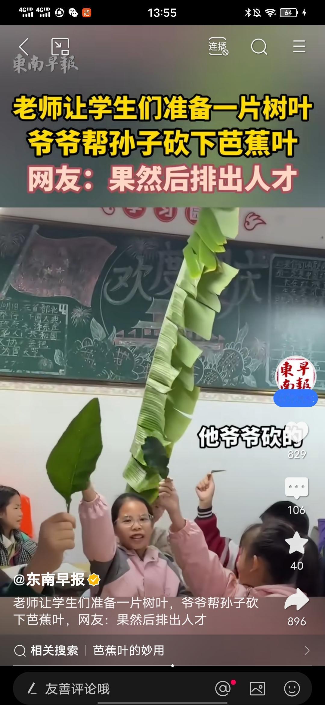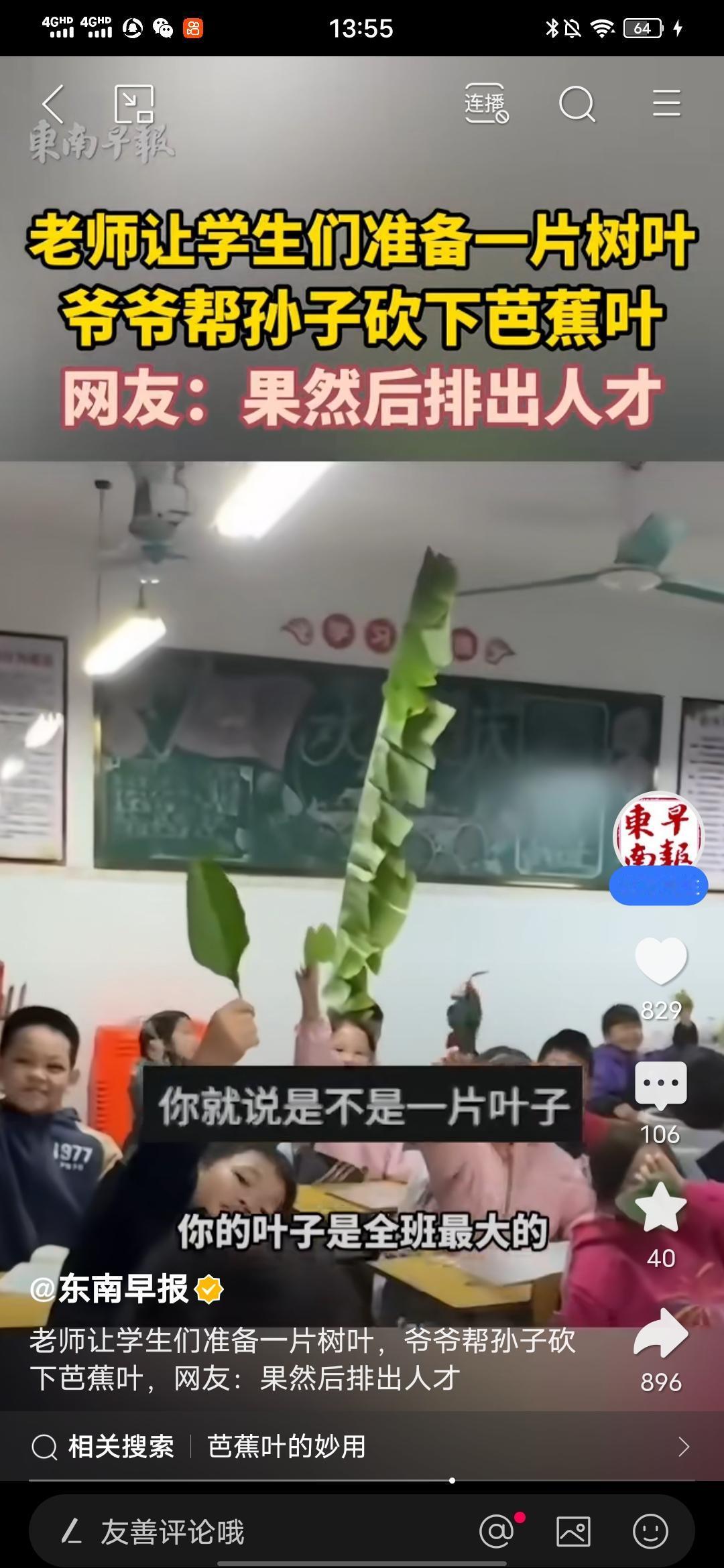 老师让学生们准备一片树叶,爷爷帮孙子砍下芭蕉叶,网友:果然后排出人才。 这是东南早报发布的消息,真的是太有趣了,这个事情发生在广西,一位老师,让学生们准备一片树叶拿到学校,结果一个小朋友带了一片大芭蕉也来学校,上学路上,这孩子一路扛着这大芭蕉“招摇过市”,太可爱了,到了学校,保安叔叔都震惊了,还问老师是不是要包糍粑。 老师也是个好老师,她并没有批评孩子,而是表达自己很震撼,问孩子是自己去摘的吗?同学们估计也很震撼,早就讨论过是谁给他摘的这个问题,所以就替同学回答老师说,是他爷爷砍的。 老师还夸他的叶子是全班最大的,老师说挺佩服你的。 芭蕉属于草本植物,芭蕉科芭蕉属,所以芭蕉叶不算树叶,所以严格说这孩子是没完成任务的,不过老师是好老师,是懂教育的老师,不但没批评,还鼓励他了,相信以后他对树叶这个知识会有更深的认识。 网友们对这个有趣的事情讨论开了,有科普树叶的,有科普芭蕉叶的,更多的是说自己爷爷为孩子们做的那些事,真的是满满的爱。有爷爷疼爱的孩子都是幸福的孩子。愿每一个孩子的童年都被温柔以待,愿每一个孩子的成长都充满乐趣。